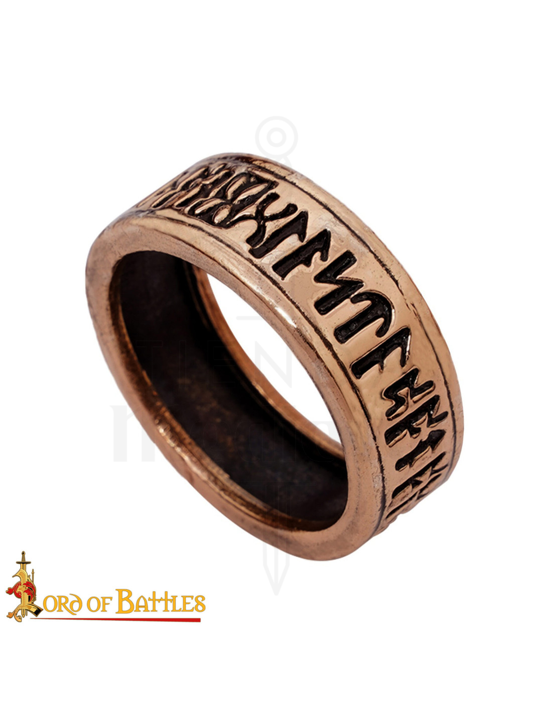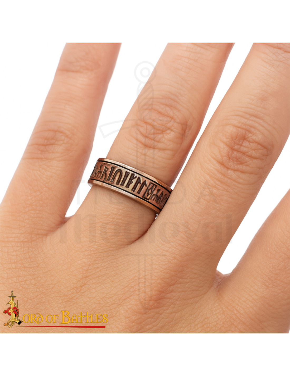 La bande large et la silhouette ferme transmettent une présence sans renoncer au confort, grâce à une face intérieure lisse et traitée pour un usage confortable même lors de longues journées. Le contour gravé en haute relief parcourt tout l'anneau avec des phrases de nature dévotionnelle et héraldique, évoquant la tradition monastique et la calligraphie gothique de l'Europe occidentale médiévale.