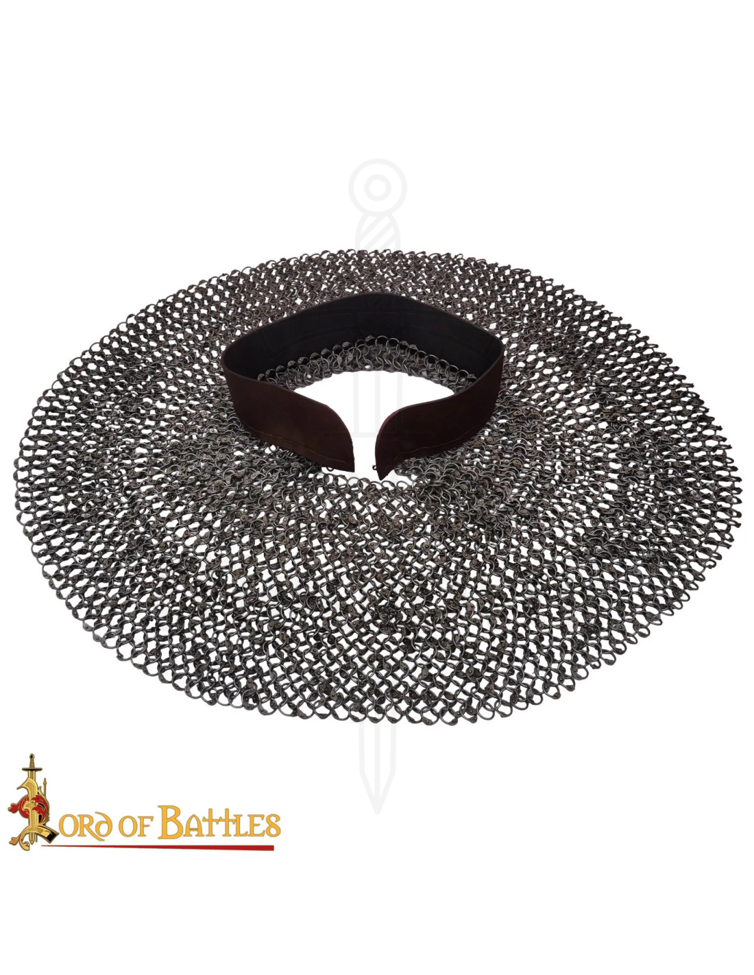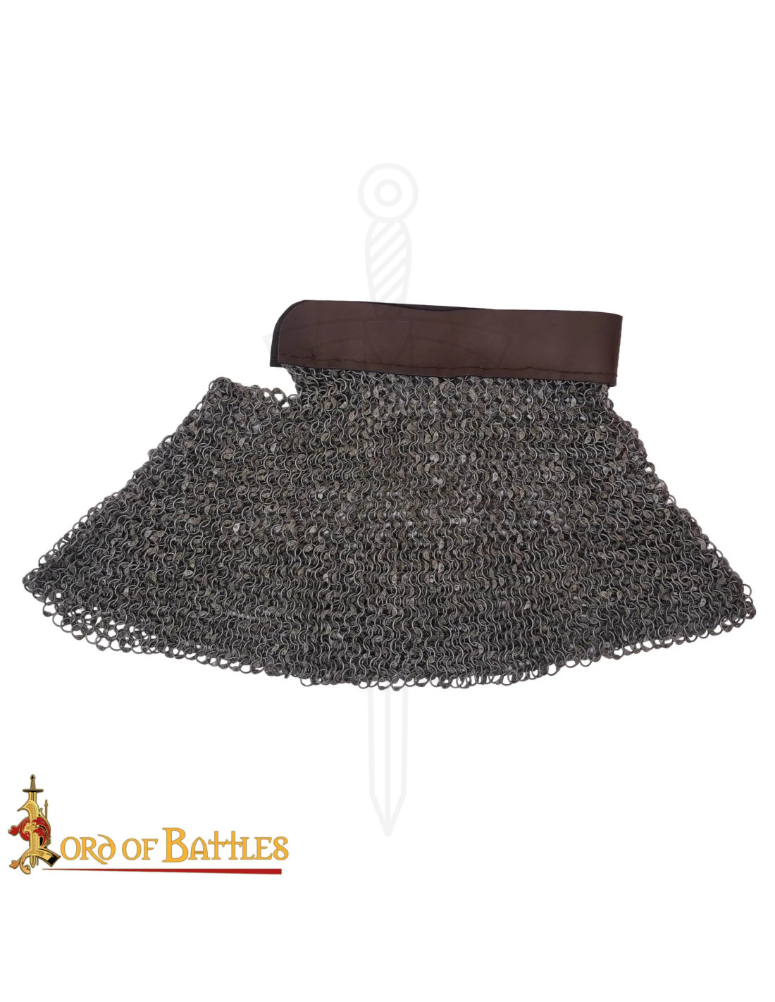 Ce gorget combine une esthétique authentique avec des avantages pratiques : la maille de maillons rivetés offre une flexibilité pour regarder, tourner et combattre, tandis que la bande de cuir véritable à la base assure un ajustement confortable et évite les frottements. La finition sombre et mate lui donne un aspect sobre qui complète et rehausse les casques et cottes, parfait pour les reconstitutions historiques comme pour les entraînements ou représentations.