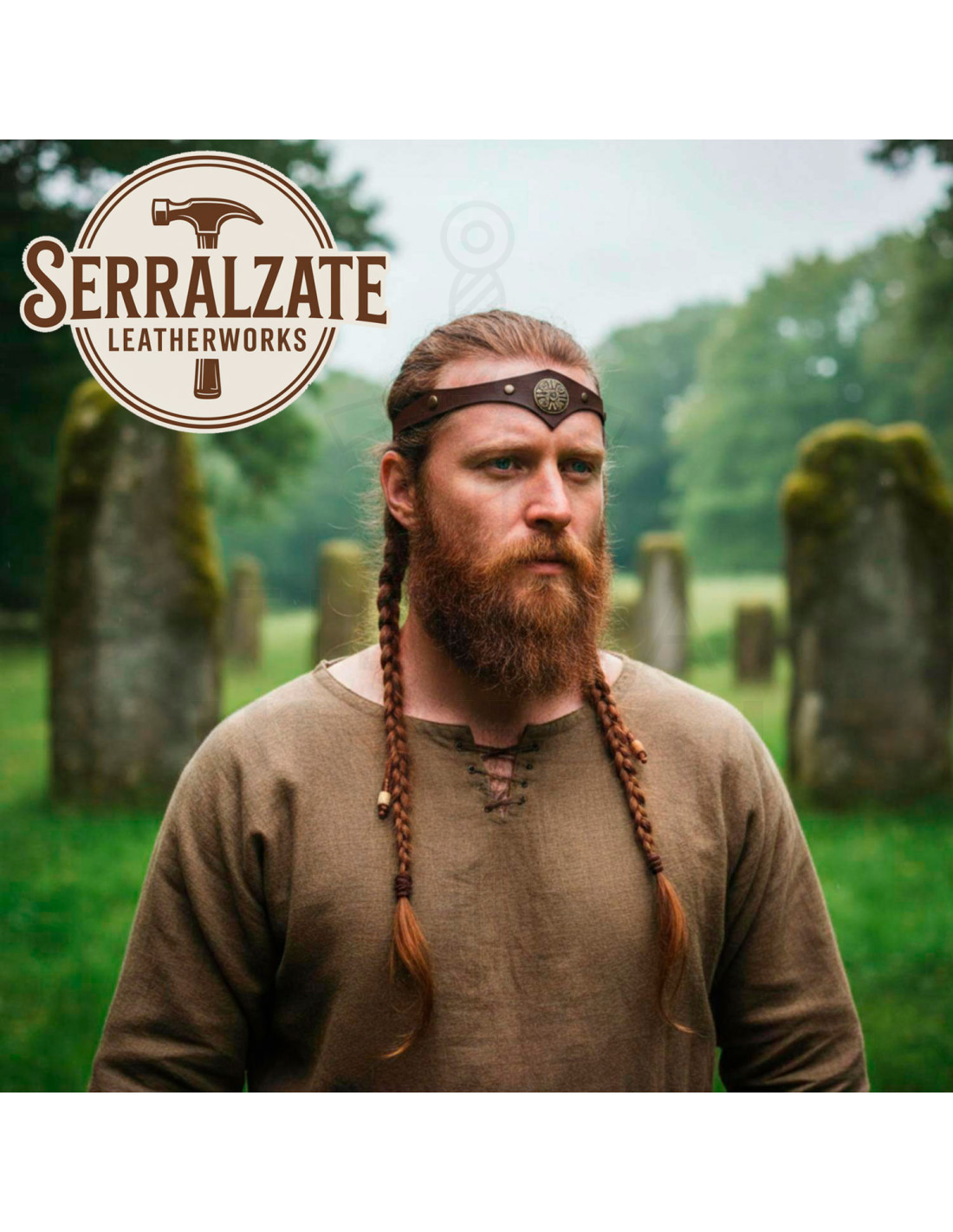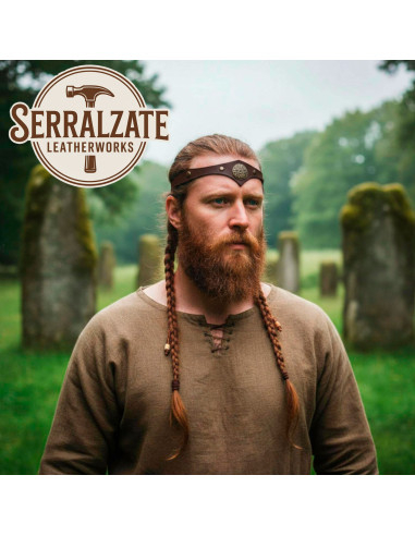 Son design protège le front avec cette élégance délicate apportée par l'ornement métallique avec motifs celtiques et rivets, mettant en valeur des détails qui reflètent l'histoire et la tradition, idéal pour les personnes appréciant les accessoires avec du caractère et de l'esprit. L'ajustement à l'arrière, grâce à un cordon en cuir, assure un confort parfait et un ajustement personnalisé, facilitant son port en différentes occasions.