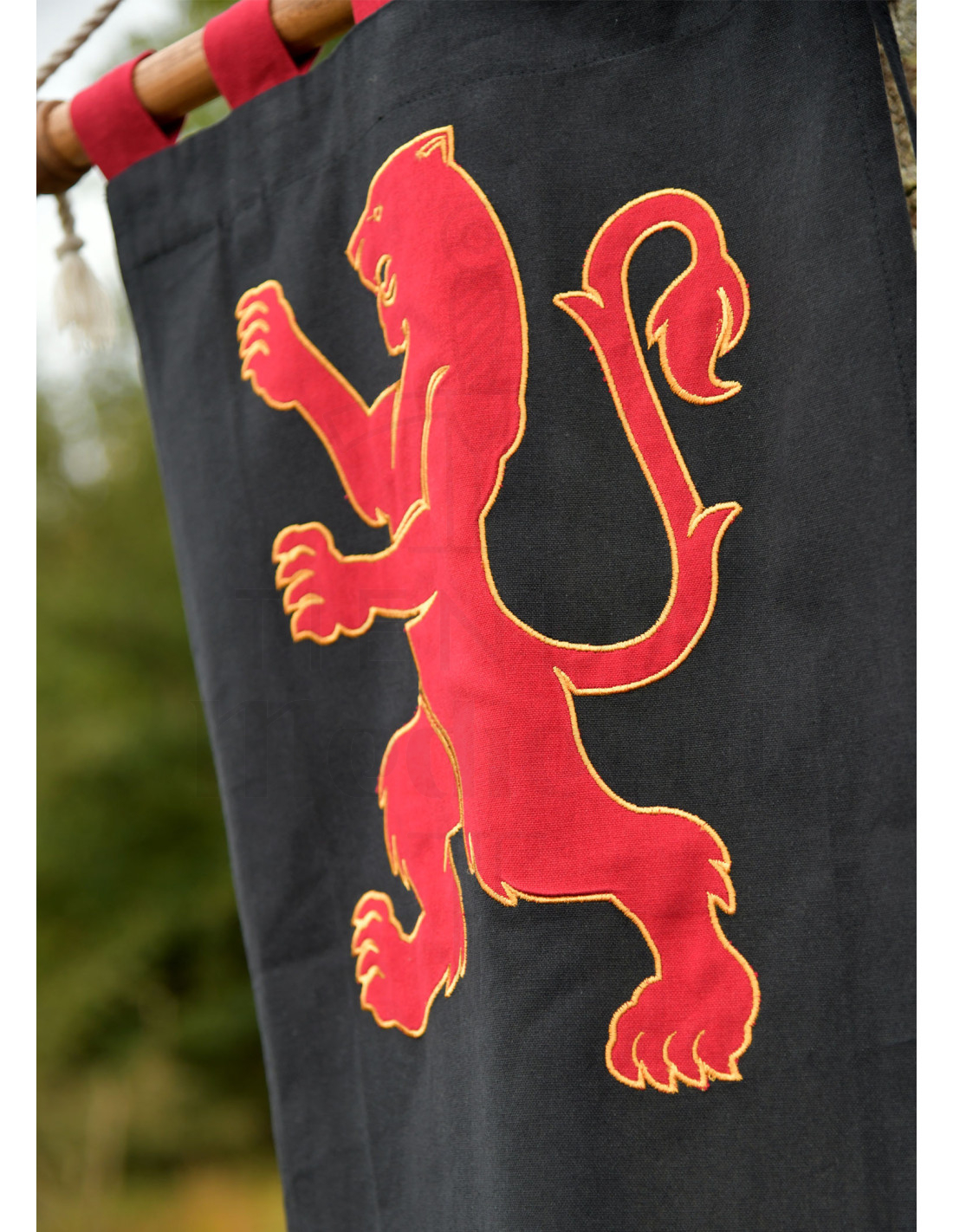 Mots-clés d'achat : acheter étendard médiéval design Lion, noir-rouge, idéal pour des décorations thématiques et reconstitutions historiques.