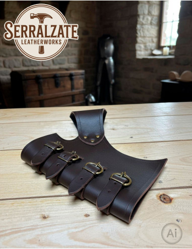 Vous cherchez un porte-épée qui allie fonctionnalité et style médiéval ? Ce tahalí Jacan, fabriqué en cuir marron foncé de haute qualité, offre une solution robuste et adaptable pour vos aventures. Son design comporte quatre courroies permettant d'ajuster précisément différentes épaisseurs d'épée, garantissant une prise en main sûre et confortable à tout moment.