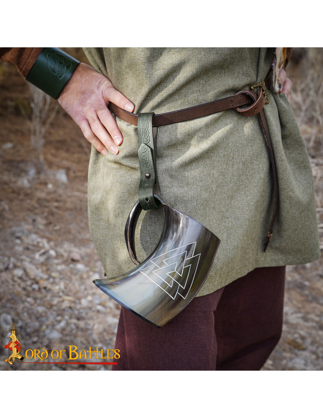 Cette sangle en cuir véritable non seulement embellit votre chope, mais transforme également l'expérience : la prise en main est plus sûre, vous réduisez les éclaboussures lors des célébrations et la pièce gagne en personnalité avec l'utilisation quotidienne. La finition mate dans une teinte foncée apporte une esthétique rustique et sobre qui s'intègre aussi bien dans une taverne de reconstitution historique que sur votre table à la maison.