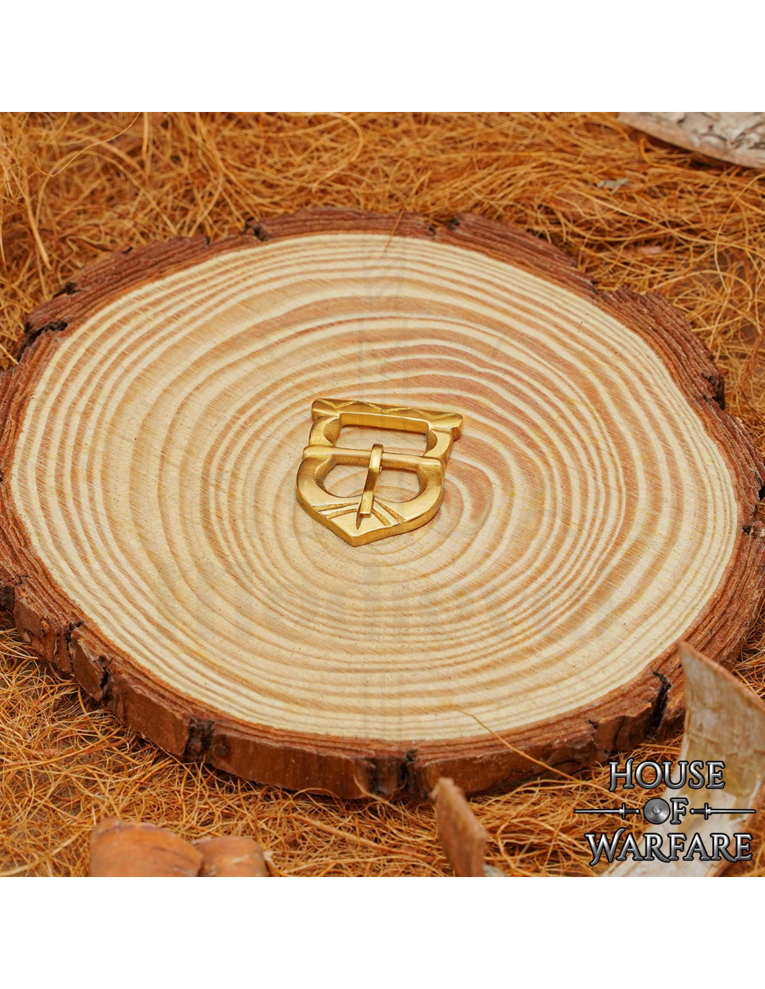 La construction en laiton offre une durabilité conçue pour un usage fréquent lors de foires historiques, de reconstitutions et de LARP, grâce à sa résistance à la corrosion et à l'usure. La finition polie et le travail fait main sur chaque pièce garantissent un aspect premium, tandis que les bords adoucis et la pièce mobile centrale facilitent un accrochage sécurisé et confortable sur des courroies étroites.