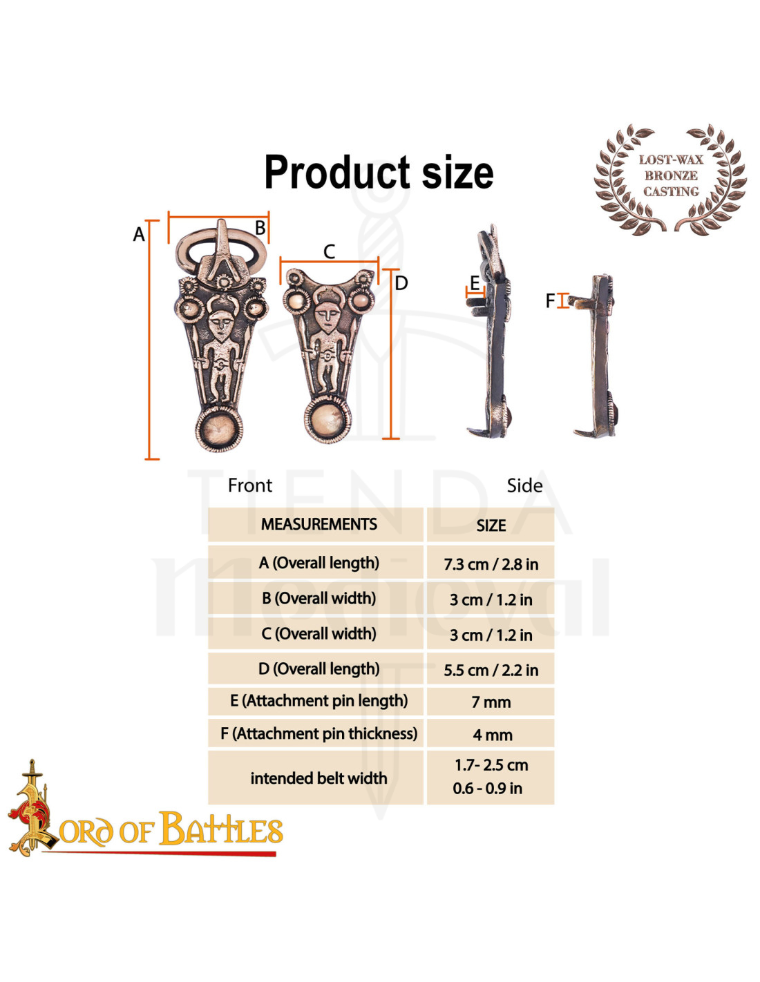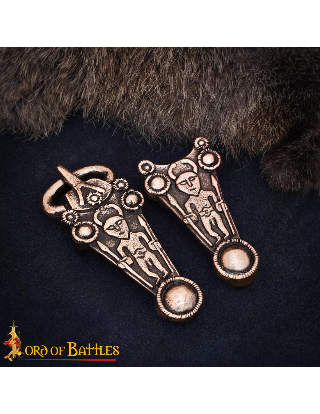 Cette boucle et embout en bronze coulé reproduisent fidèlement le goût ornemental des siècles VIII–X, avec des figures anthropomorphes et des disques solaires qui apportent une touche rituelle et protectrice à toute tenue. La finition vieillie et la légère irrégularité de la surface transmettent la valeur de l'artisanat, rendant chaque pièce unique et conférant à vos accessoires une présence authentique et caractéristique.