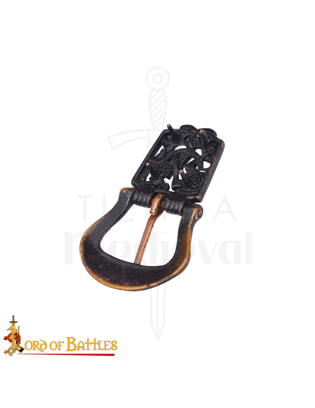 Cette boucle en bronze fondu reproduit le caractère des ornements de l'époque, avec un motif ouvert de bêtes entrelacées qui joue avec la lumière et l'ombre, mettant en valeur chaque relief grâce à son aspect vieilli. La technique de coulée à la cire perdue permet un fini profondément texturé, ce qui apporte non seulement une authenticité visuelle, mais garantit que chaque trait du design reste défini avec l'utilisation.