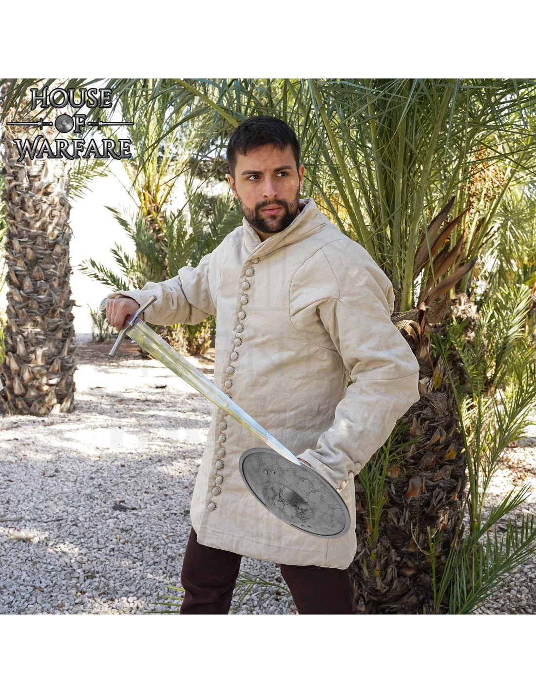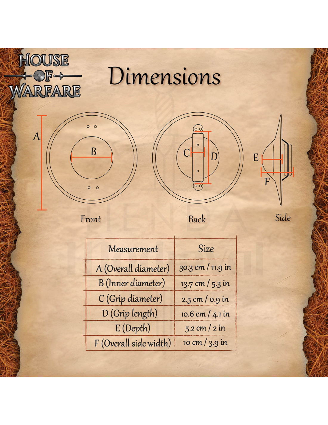 Le manche en bois renforcé avec des rivets métalliques assure une prise ferme et fiable lors des manœuvres rapides, et les paires de rivets visibles autour du dôme ajoutent à la fois robustesse et un détail historique attrayant. Son équilibre permet des mouvements agiles lors des pratiques, reconstitutions et mises en scène.