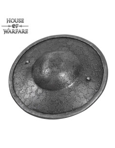 Ce bouclier, forgé en acier avec une finition vieillie et une texture naturelle, offre une apparence rustique qui se démarque sans avoir besoin de peintures. Sa surface irrégulière et le gris métallique évoquent l'usure réelle de la bataille, tandis que la protubérance centrale, bien marquée, dévie les impacts et protège la main lors des rencontres les plus rapprochées. Le bord légèrement surélevé renforce la structure, apportant une sensation de solidité au blocage et à la redirection des coups.