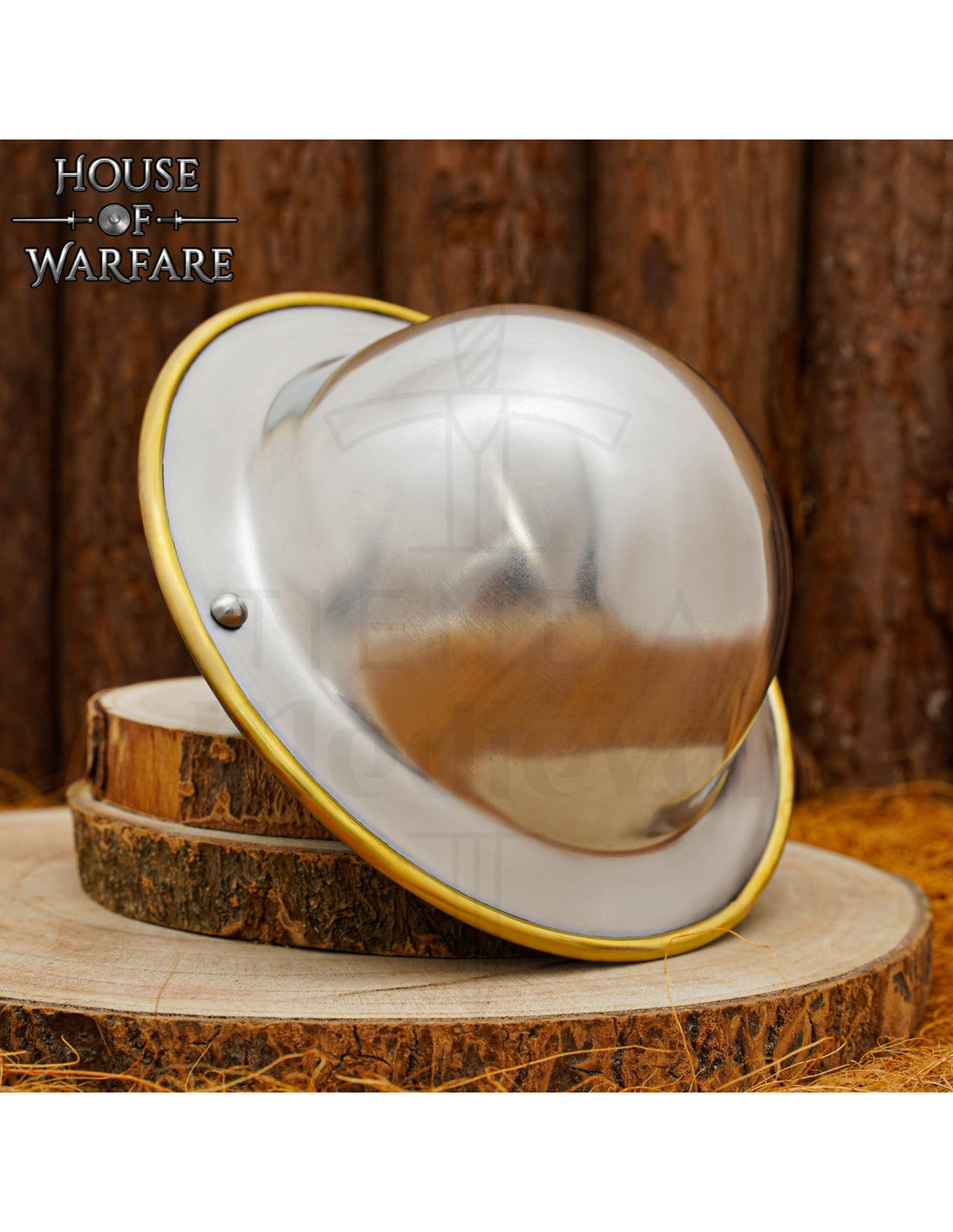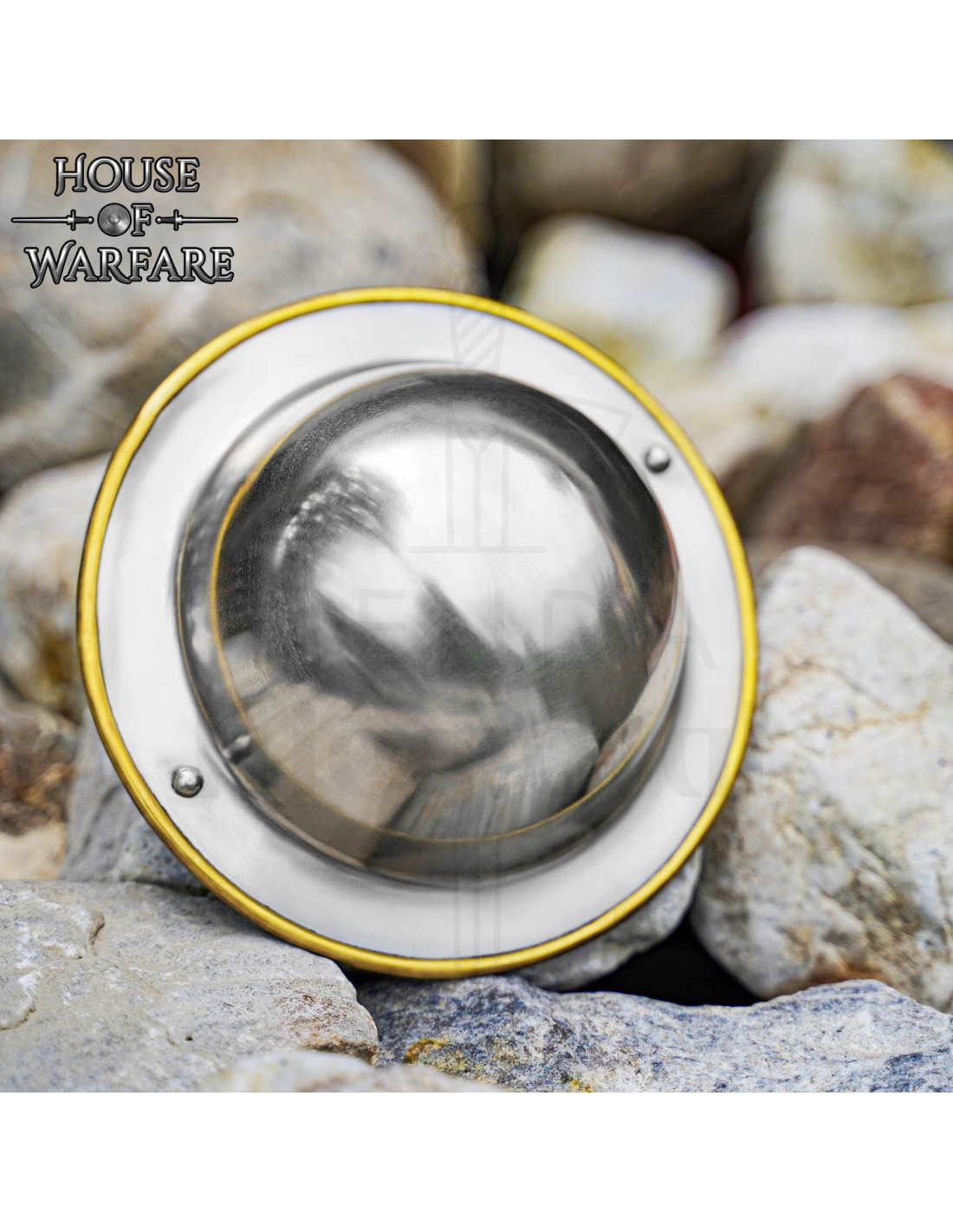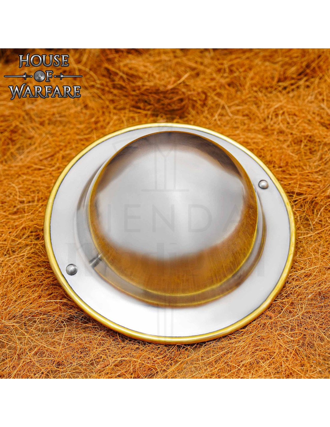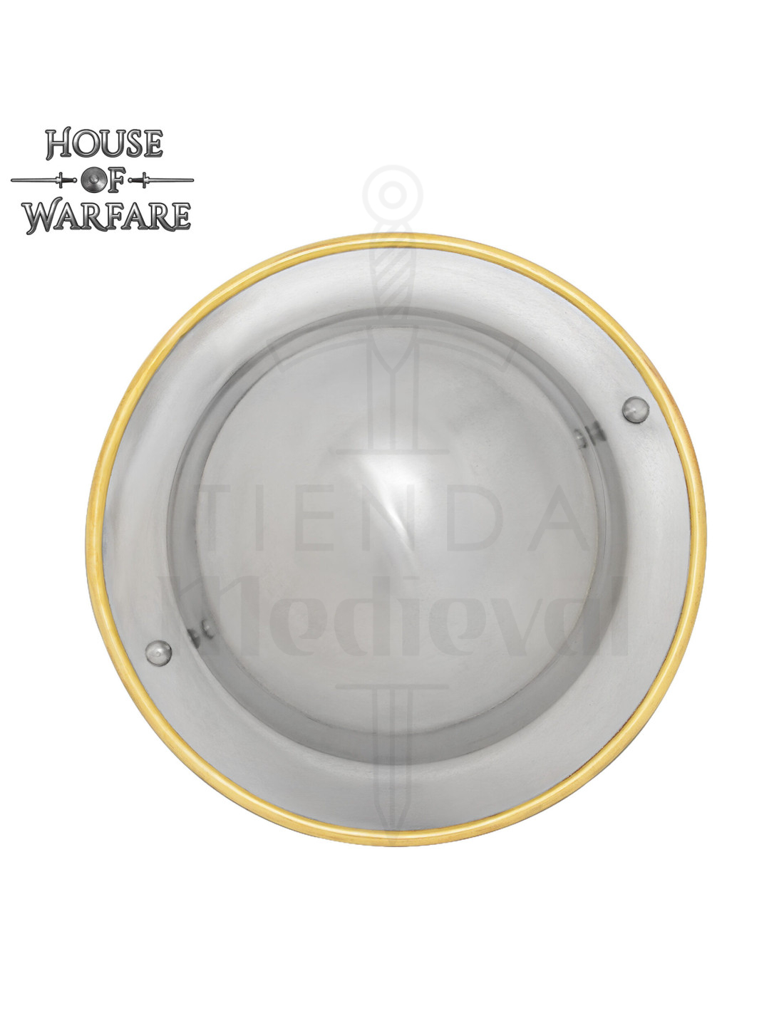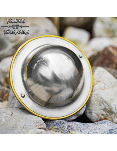 Sa forme circulaire et sa finition métallique brillante attirent non seulement les regards, mais facilitent également des mouvements plus agiles et des défenses rapides lors des combats simulés. Le bord doré qui parcourt toute la circonférence ajoute un contraste élégant qui le fait ressortir tant dans une reproduction historique que dans une collection moderne.