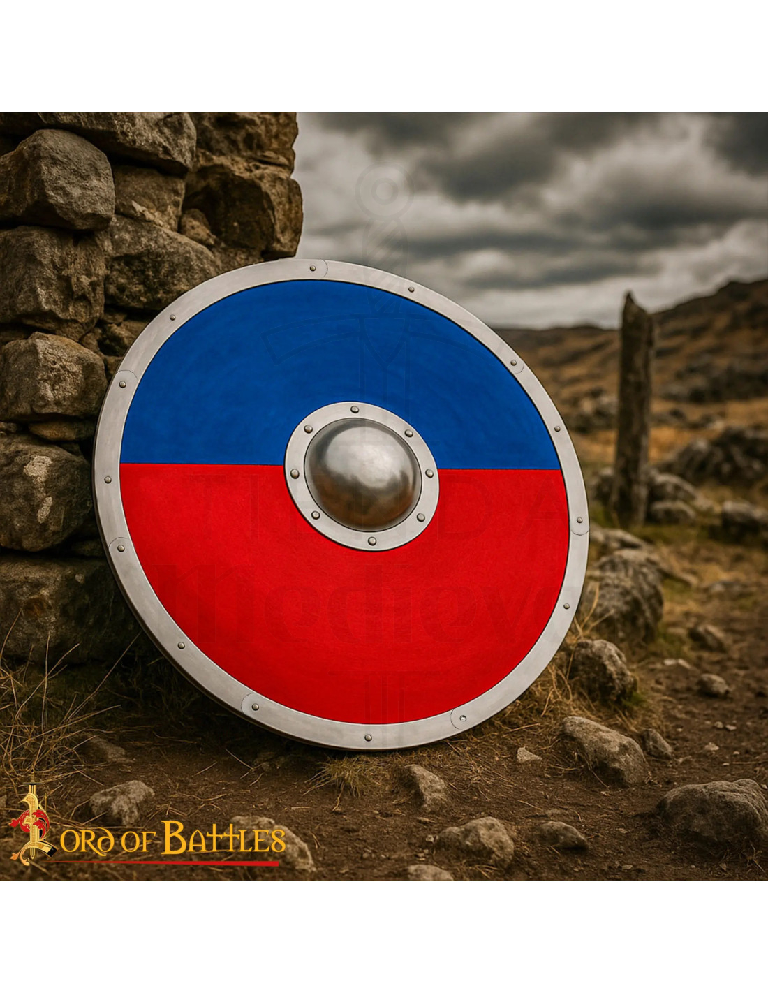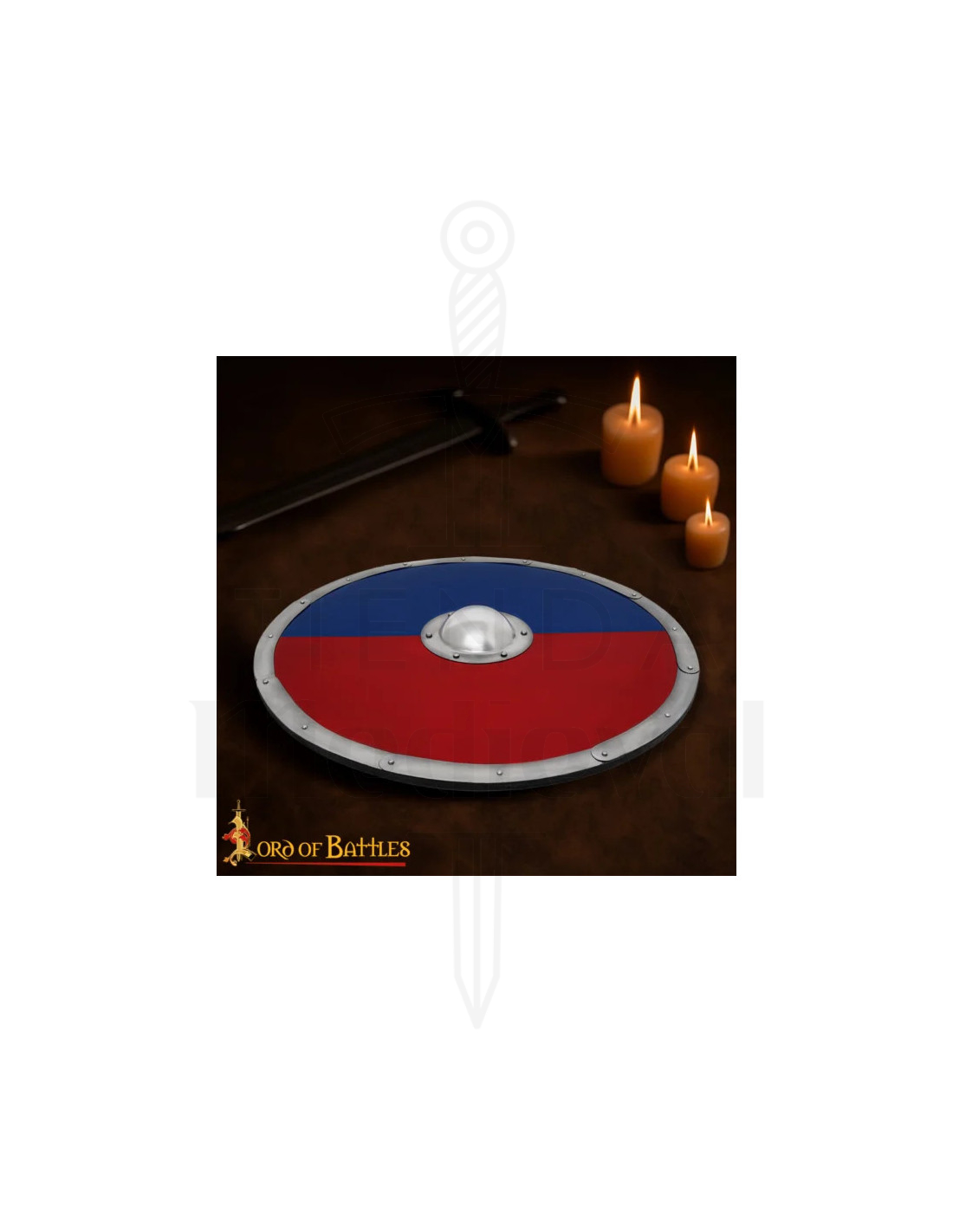 La division horizontale frappante en bleu en haut et rouge en bas crée un contraste visuel parfait pour les performances, les reconstitutions ou la décoration, tandis que le bord métallique riveté ajoute une touche de réalisme qui résiste à l'utilisation continue. Le pommeau central en métal, fixé par des rivets, renforce non seulement l'esthétique, mais protège aussi la zone de prise et accentue cet aspect authentique d'équipement de combat.