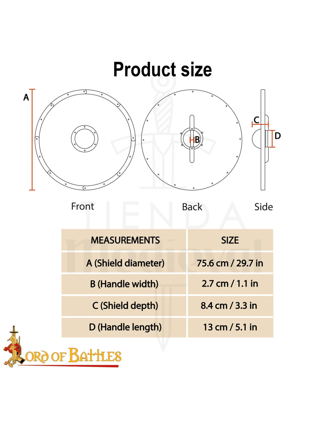 Chaque unité est réalisée à la main, ce qui permet d'apprécier de petites variations dans la peinture et les veines du bois, rendant chaque bouclier unique. Idéal pour les collections, les costumes d'époque et les représentations avec exigence esthétique et fonctionnelle.