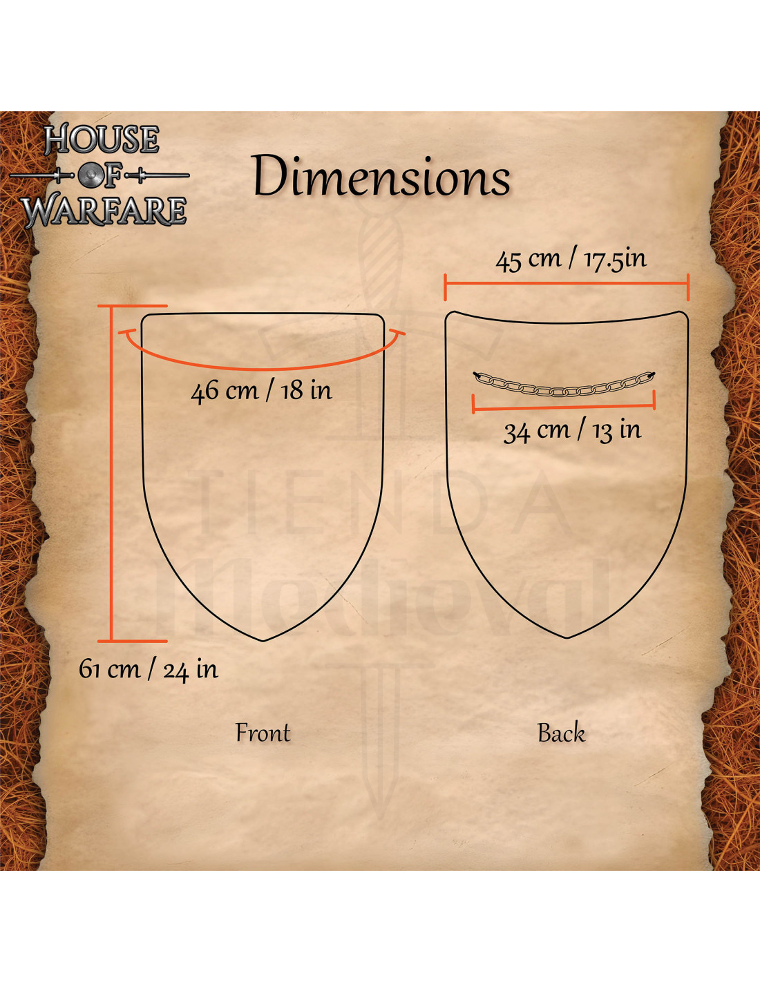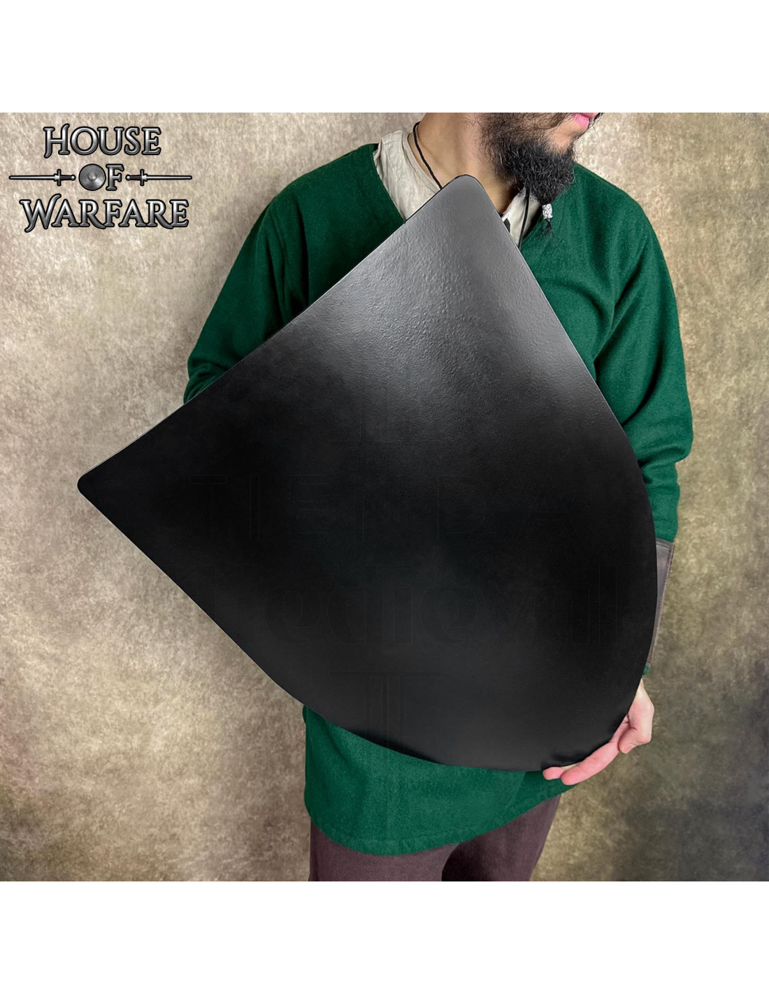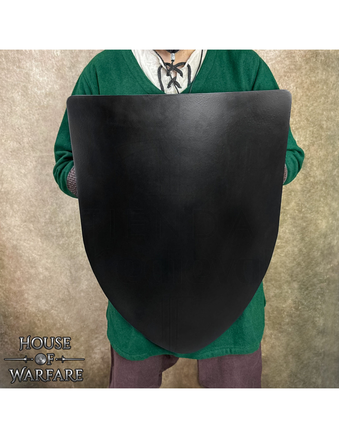 Imaginez un bouclier qui combine présence visuelle et capacité réelle d'utilisation en combat et en exposition ? Ce design capture ce mélange : une face lisse de couleur noire qui fonctionne comme une toile prête pour votre emblème, et une silhouette classique qui protège le torse avec un style historique.