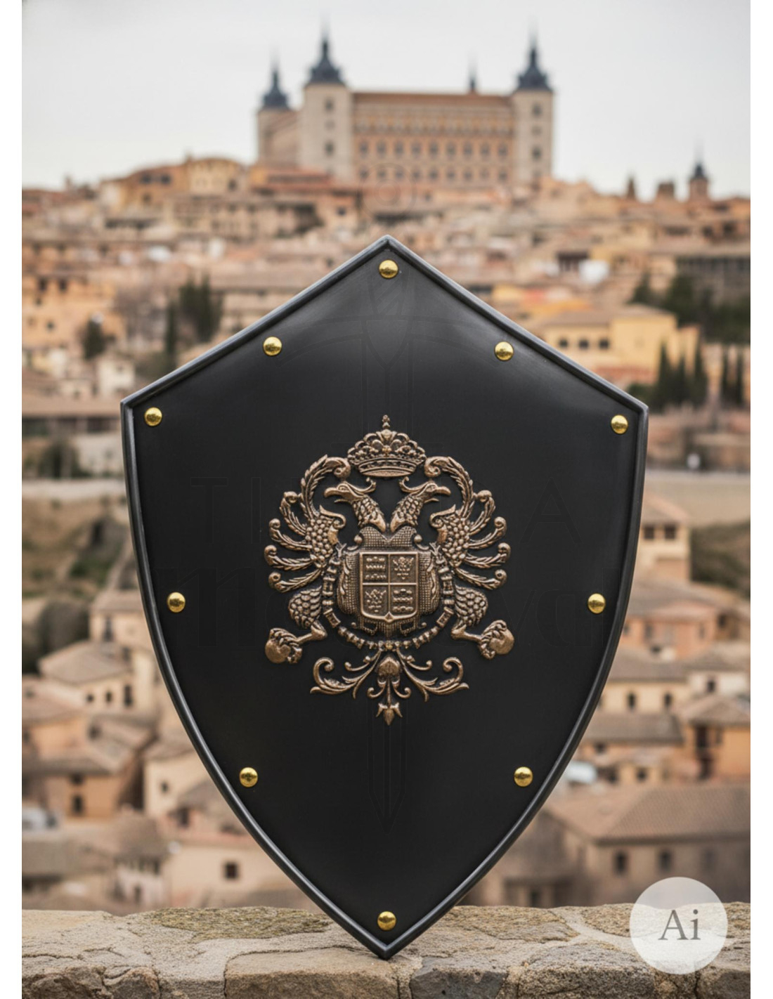 Découvrez le bouclier décoratif médiéval de l'aigle à deux têtes de Tolède ! Ce bouclier impressionnant est fabriqué avec les normes de qualité les plus élevées, garantissant sa durabilité et sa résistance. Sa conception détaillée et soignée, ainsi que sa finition zinguée et polie, lui confèrent un aspect authentique et élégant.