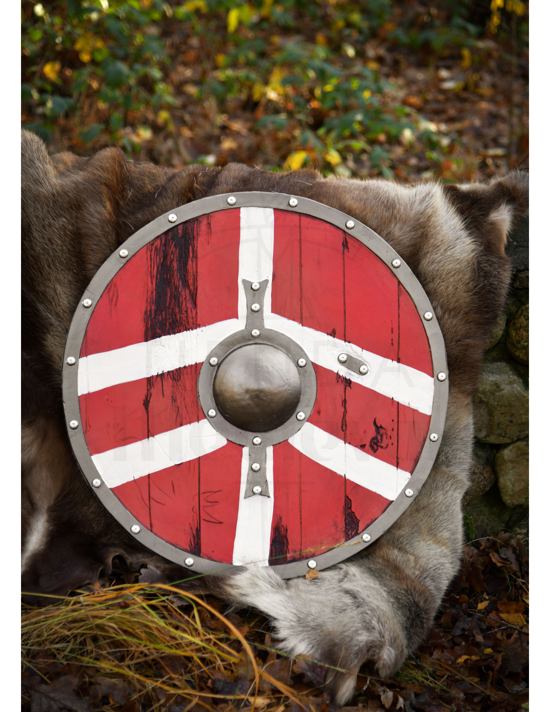Avec un aspect rugueux et travaillé, ce bouclier vous invite à vous déplacer en toute confiance : son design équilibré permet des rotations agiles et des blocages précis, afin que chaque manœuvre au combat se ressente de manière naturelle et contrôlée. La surface peinte en rouge avec une croix blanche et des lignes géométriques apporte une présence sur scène, tandis que les marques de bataille simulées et l'esthétique du bois vieilli racontent des histoires sans besoin de mots.