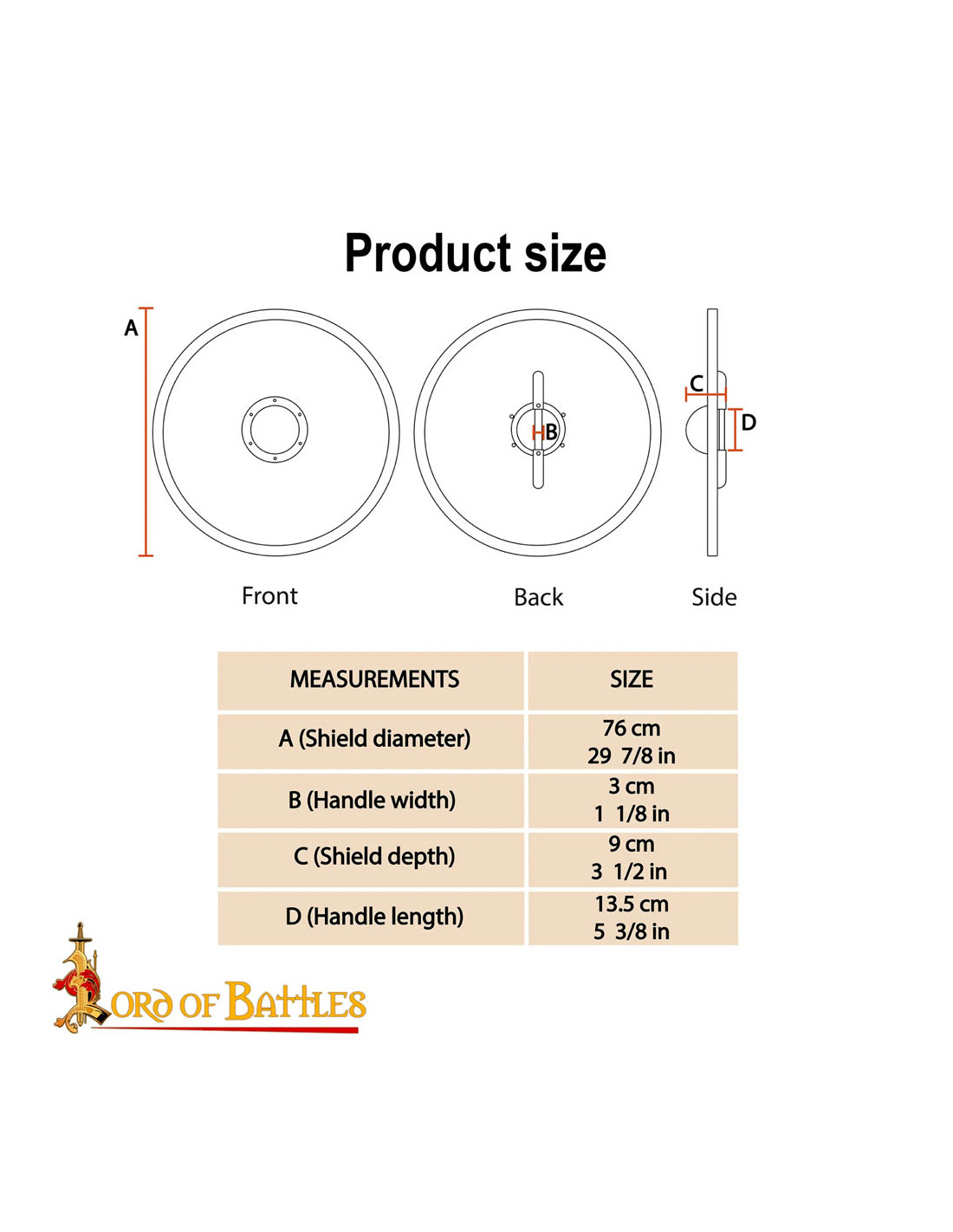 Le bouclier est doté d'une poignée en métal renforcée d'un couvercle en bois, vous offrant une prise ferme et confortable pendant le combat. De plus, sa grande largeur de 76 cm offre une couverture optimale, garantissant votre protection à tout moment.