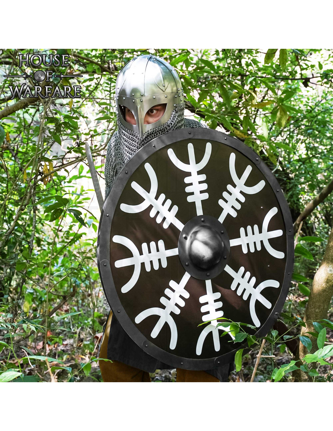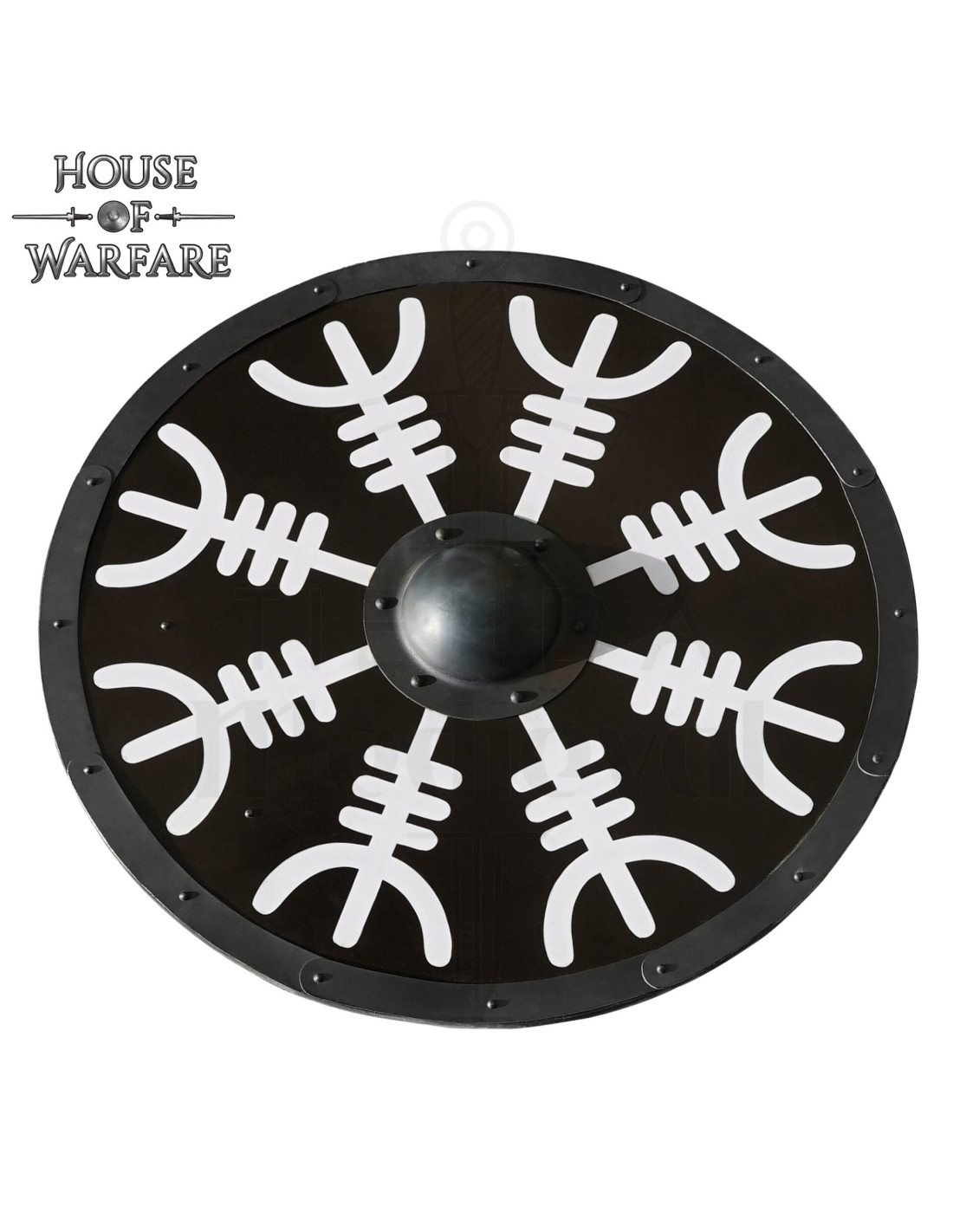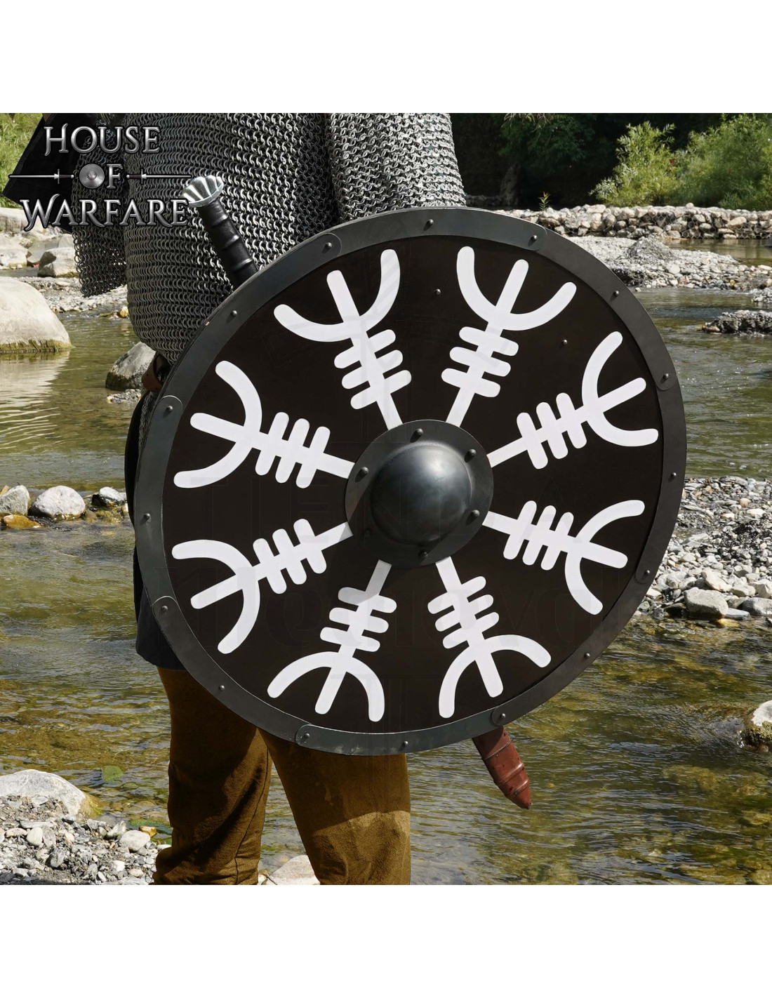 La finition en noir et blanc avec le symbole de Aegishjalmur domine la surface, affichant huit emblèmes disposés en parfaite symétrie autour d'un bossage métallique central, ce qui lui confère un aspect authentique et visuellement frappant pour des photographies, des tournages ou des expositions.