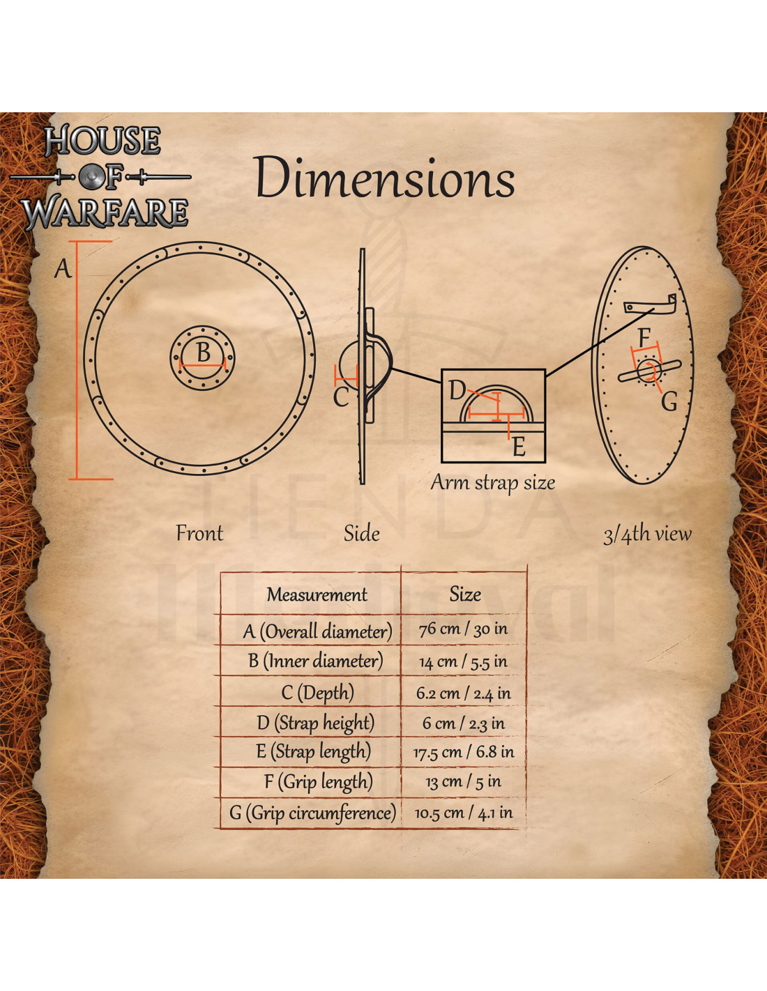 Le bossage en dôme et le bord riveté agissent comme une protection efficace de la main et du périmètre, prolongeant la durée de vie de l'article même dans un usage répétitif, tandis que les rivets visibles renforcent cet aspect guerrier qui attire tant les collectionneurs et les passionnés.