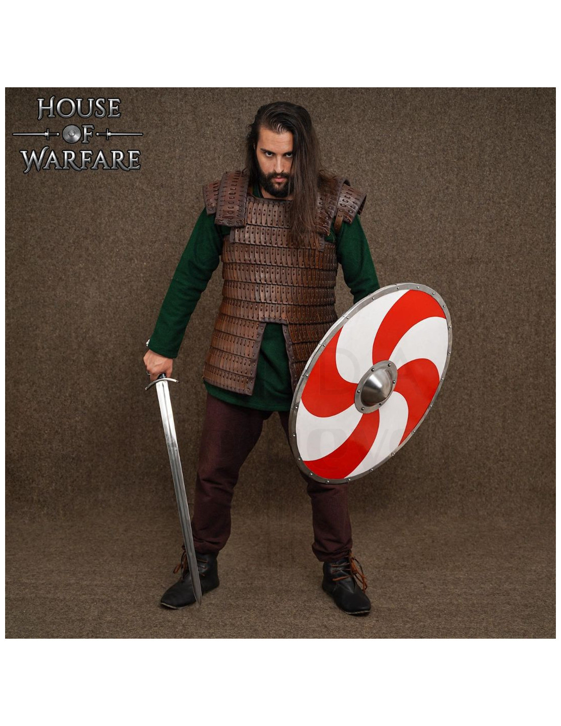 Ce bouclier rond offre un équilibre entre présence visuelle et fonctionnalité pratique, facilitant son installation en tant que pièce maîtresse sur un mur ou son utilisation lors d'événements où l'apparence et la fiabilité sont essentielles. Sa finition allie métal et peinture, obtenant un rendu qui semble historique et soigné.