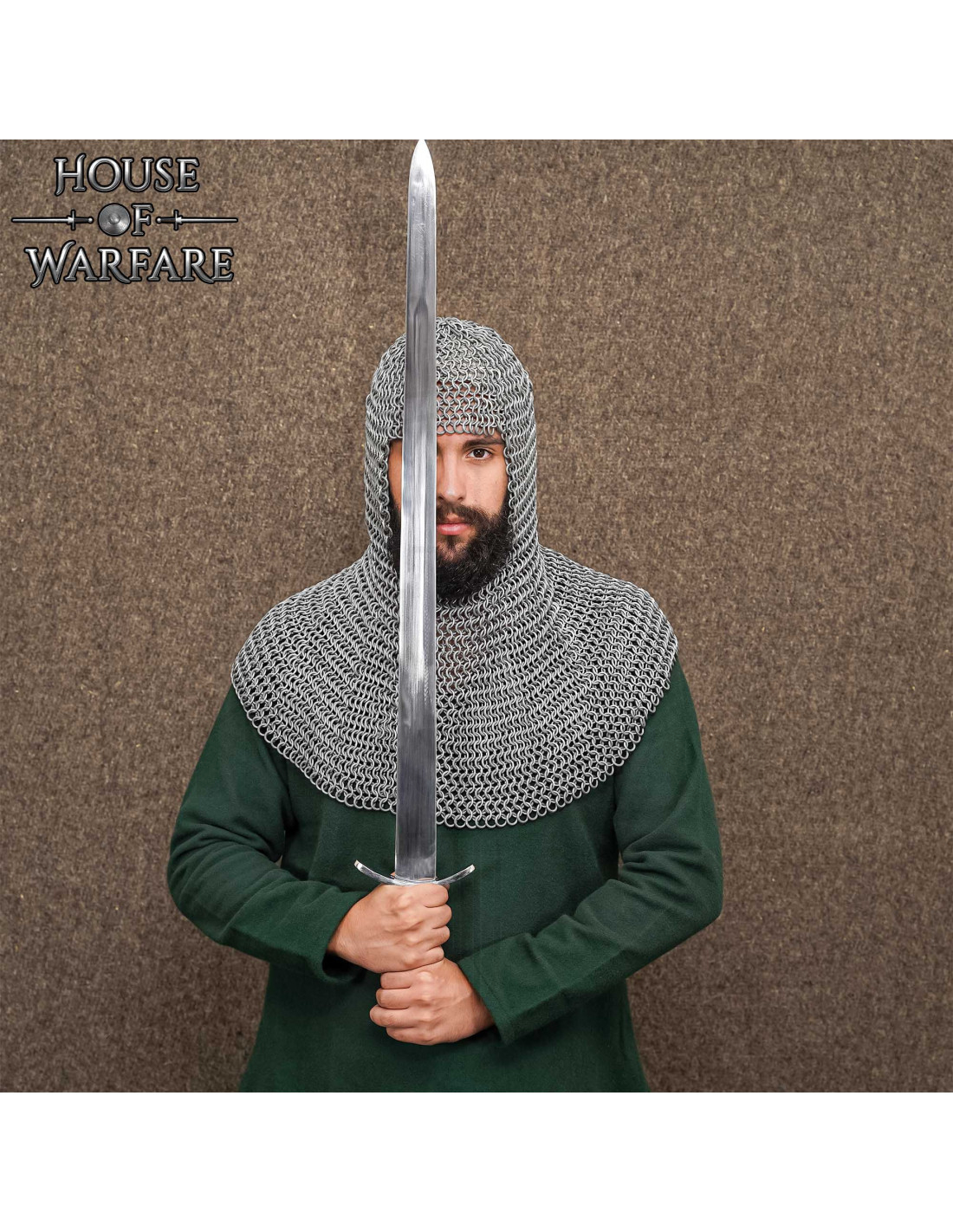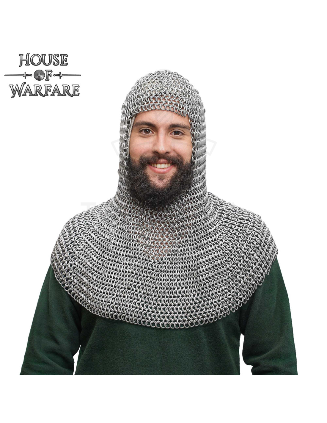 Cette coiffe évoque la période médiévale des XIIe au XIVe siècles, recréant la silhouette classique européenne avec un vol au bord qui protège le cou et les épaules sans limiter les mouvements. Sa finition gris mat avec une apparence d'acier apporte un aspect robuste et réaliste, comme on peut le voir sur l'image, où la maille tombe naturellement sur la tête, les épaules et le haut de la poitrine.