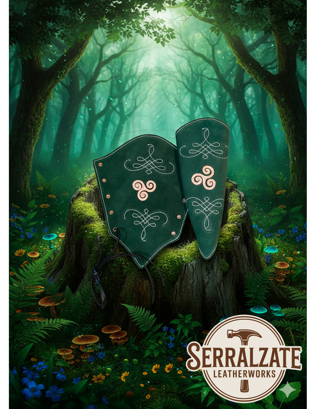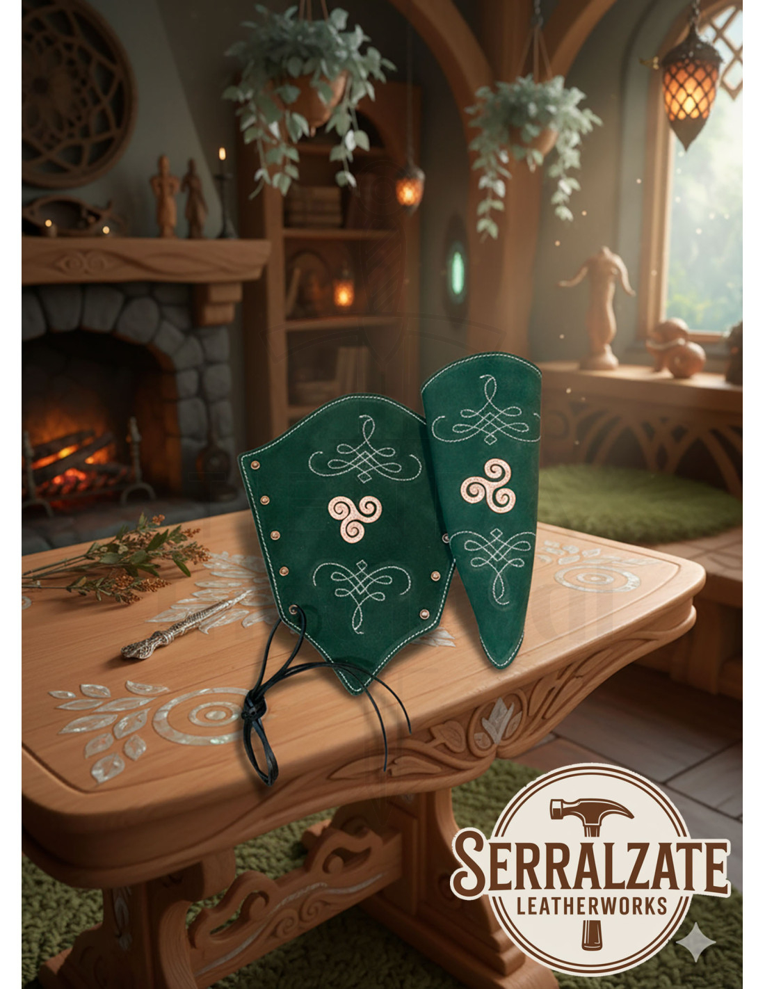 Le design unique des Nyara présente une extension à l'arrière de la main, ce qui leur confère non seulement une touche distinctive, mais aussi une protection et une allure sophistiquée. La finition soignée et les décorations fines enrichissent leur apparence, en faisant un accessoire visuellement attrayant. L'un des éléments les plus remarquables est le triskele artistiquement conçu, soigneusement cousu au centre des bracelets, symbolisant le mouvement et la croissance, et apportant un caractère particulier à chaque pièce.