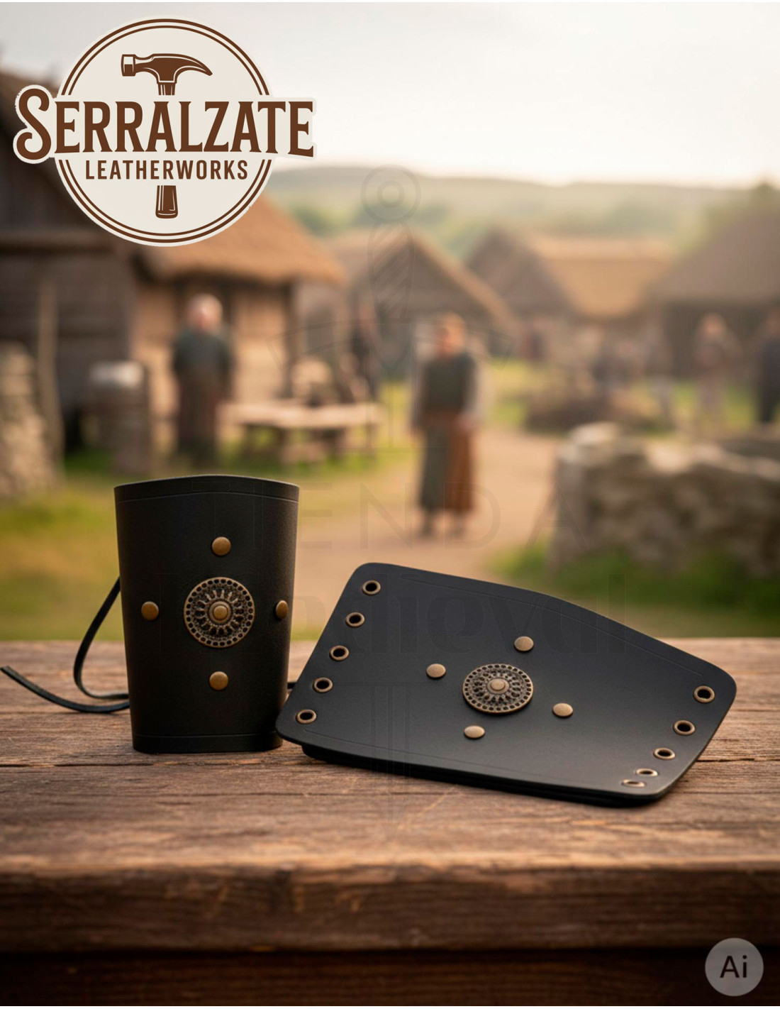 La paire de bracelets roue celtique, noirs, associe une roue celtique en plaqué métal à du cuir véritable travaillé à la main, pour offrir un équilibre entre présence visuelle et confort lors du port. Chaque détail a été élaboré par des artisans réputés en Espagne, garantissant une finition soignée que l'on ressent au toucher et au regard, sans être encombrante.