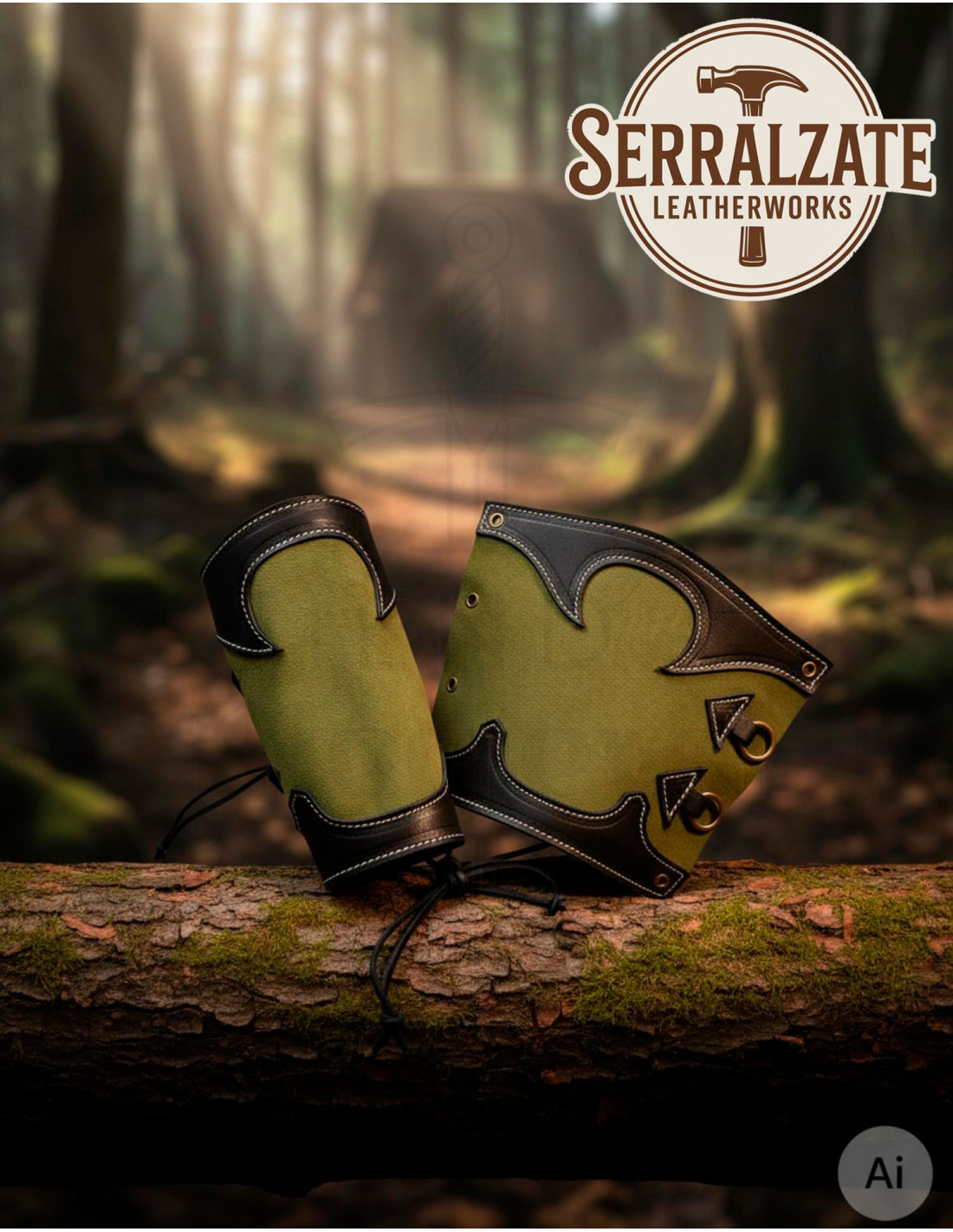 Ils sont vendus par paire, conçus pour un équilibre esthétique et pratique, afin que vous gagniez en protection sans perdre en sensibilité ni en habileté. Le contraste entre le cuir foncé et le suède vert s'harmonise non seulement avec les paysages forestiers et offre un camouflage discret, mais reflète également l'engagement et la résilience du Garde Forestier, un rôle classique de protecteur et de traqueur qui vit à la lisière du royaume, surveillant les chemins et les forêts interdites.