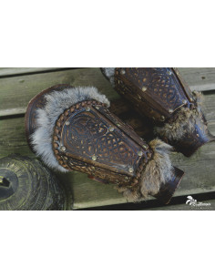 Fabriqués en cuir de haute qualité, chaque détail a été conçu pour ressortir. Ses plaques teintées à la main et ses gravures complexes de style viking mettent en avant les motifs nordiques les plus authentiques. La couverture supérieure en peau de lapin naturel, cousue à la main, ajoute une touche distinctive, alliant douceur et élégance. Les tonalités de brun, associées à des rivets décoratifs et des coutures visibles, renforcent son caractère robuste et authentique.