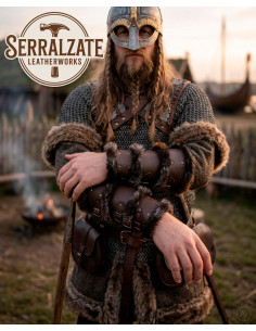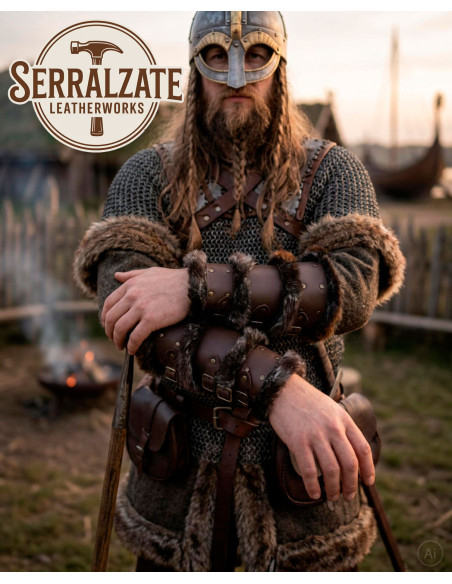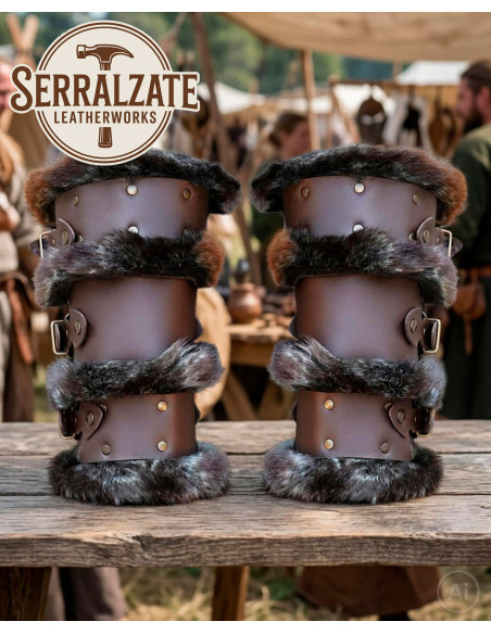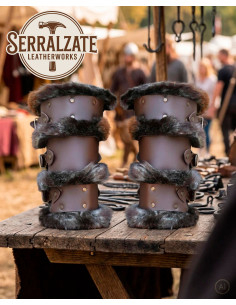 Présentés sur une table en bois rustique, ils transmettent cet air de marché artisanal et de scène historique qui renforce toute reconstitution. Si vous cherchez à acheter des bracelets vikings en cuir marron foncé avec fourrure synthétique, vous trouverez dans cette paire à la fois l'esprit visuel et la praticité nécessaire pour des événements, des costumes et des reconstitutions.