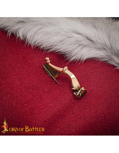 L'arc élégant et la tête avec une poire apportent non seulement un attrait esthétique classique, mais facilitent également une attache sûre et élégante sur les tissus, apportant un point de fixation qui embellit sans sacrifier le confort. La plaque de fixation allongée et triangulaire, combinée au mécanisme de ressort double enroulé, garantit une fixation fiable, idéale pour des récréations, des costumes détaillés ou comme objet fonctionnel dans des vêtements historiques.
