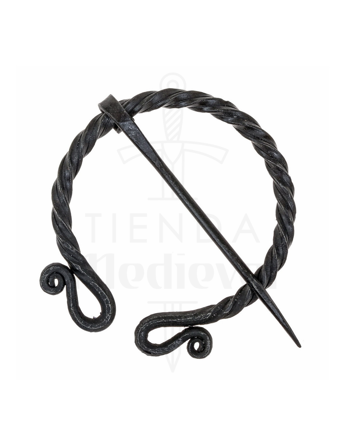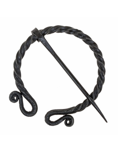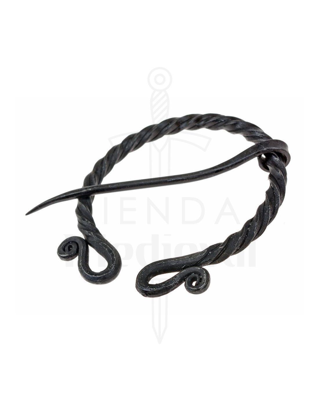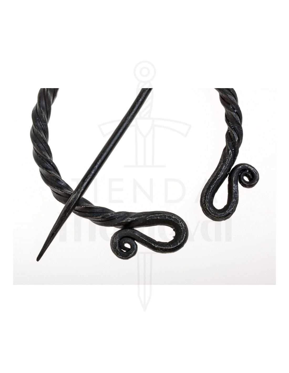 Cette pièce, forgée à la main, présente un anneau formé de deux tiges torsadées qui dessinent une omega parfaite, ornées d'spirales décoratives, et une longue aiguille qui glisse à l'intérieur de l'anneau pour un fermoir propre et ferme. La surface mate en noir et la texture légèrement rugueuse renforcent cette présence rustique, idéale pour ceux qui recherchent un accessoire avec du caractère qui ne se remarque pas de manière ostentatoire.