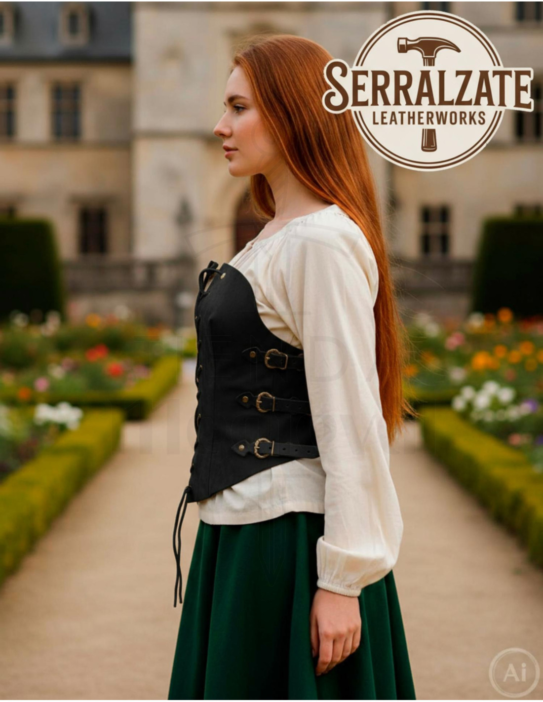 Fabriqué à la main en Espagne avec du cuir authentique velours de couleur noire, il offre une texture douce et chaleureuse qui sublime toute pièce que vous portez en dessous, sans nuire à la mobilité. La fermeture frontale avec lacets et œillets métalliques permet un ajustement précis et confortable, afin que vous puissiez marquer la silhouette que vous préférez sans complications.