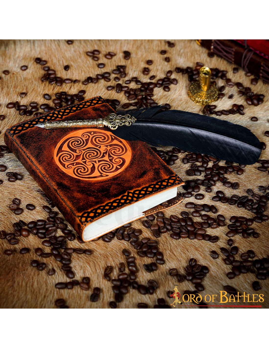 La couverture en cuir foncé, travaillée avec une finition vieillie, apporte une présence chaleureuse et robuste qui transforme le quotidien en quelque chose d’exceptionnel. La décoration circulaire centrale, avec un motif d’entrelacs de spirales de style celtique en tons marron et orange, ainsi que les bordures décoratives supérieure et inférieure, ajoutent un caractère artisanal facilitant la connexion avec vos idées dès le premier trait.