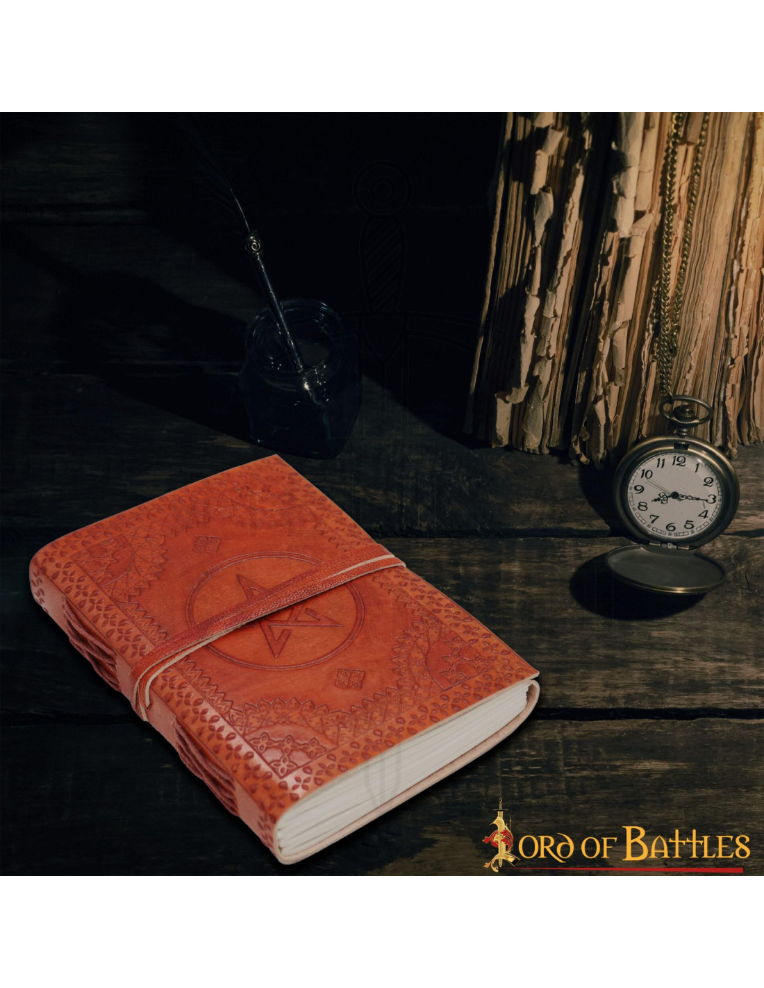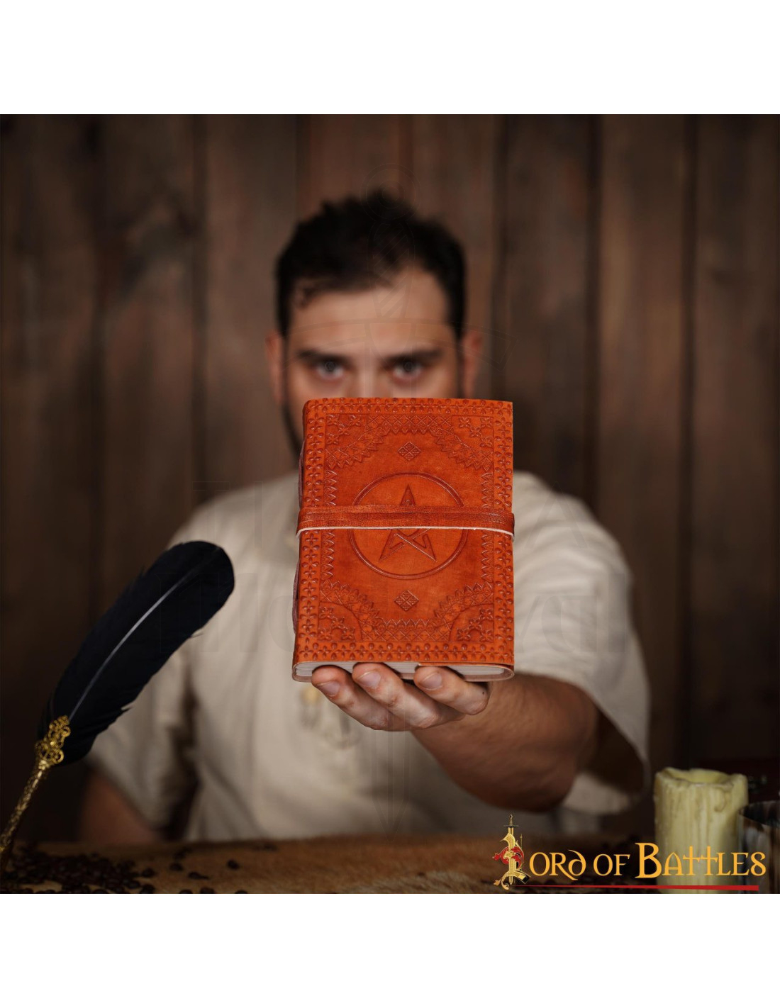 La couverture présente un relief détaillé, avec des motifs géométriques et un symbole central à cinq pointes dans un cercle, faisant du carnet une pièce visuellement puissante. Ce sceau n'est pas seulement décoratif, c'est aussi un emblème qui se connecte à la figure du quêteur, le voyageur qui enregistre phares, récifs et souvenirs, faisant du journal un allié symbolique et pratique sur toutes les routes.