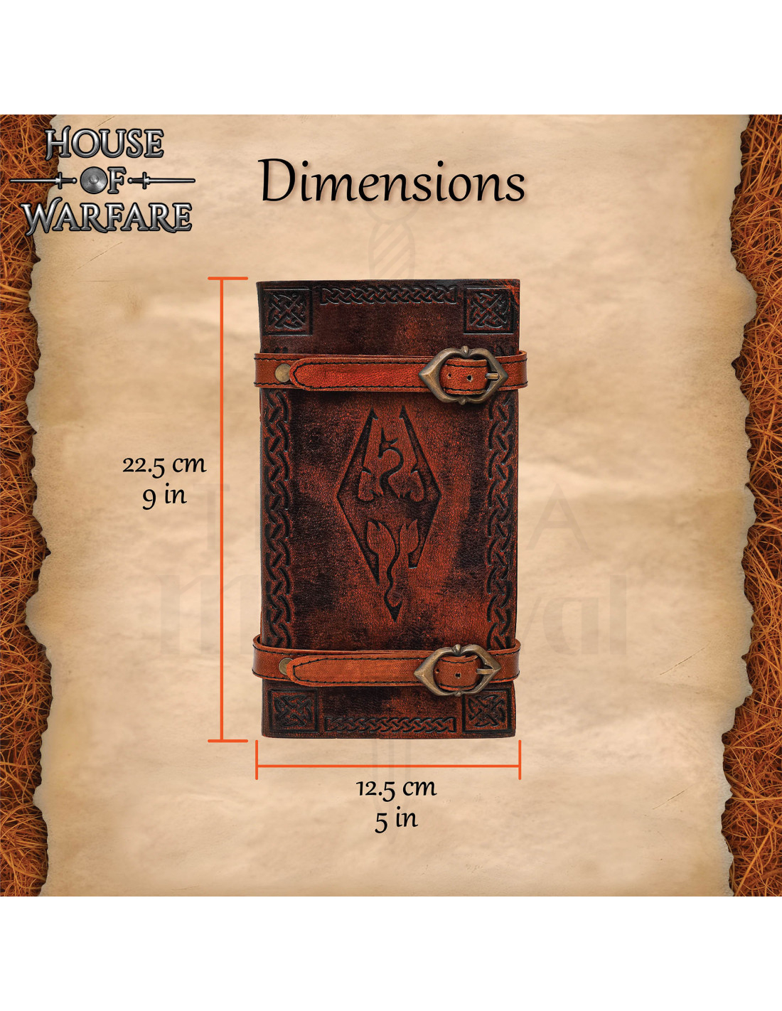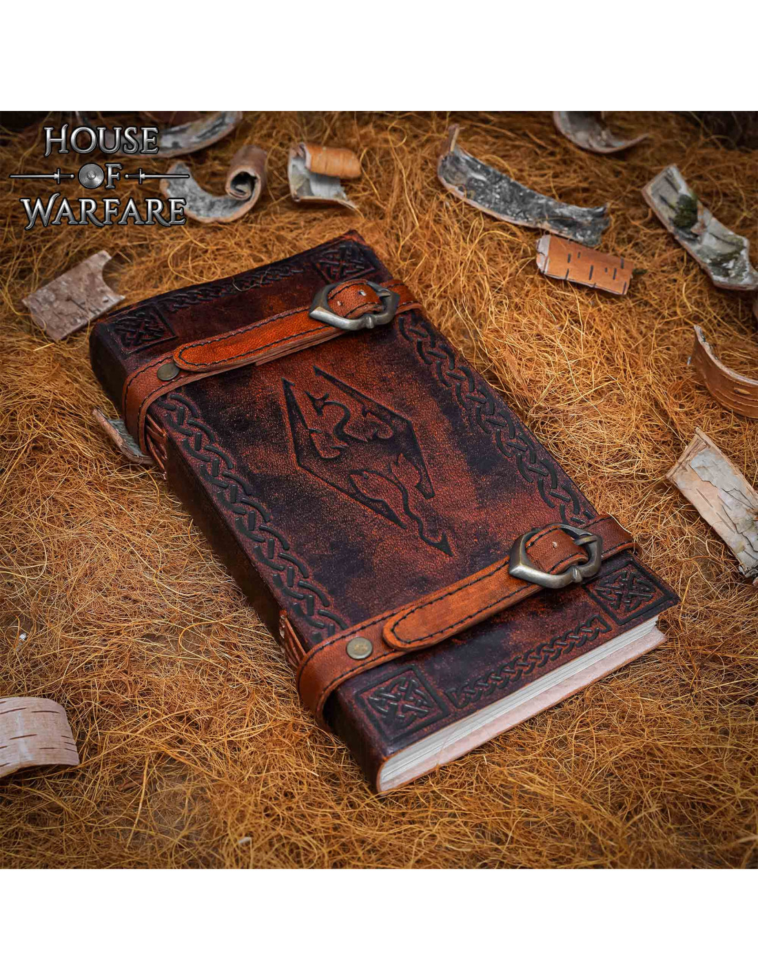 La fermeture avec deux sangles en cuir et des boucles en bronze maintient les pages en sécurité, permettant une ouverture et une fermeture faciles, tout en ajoutant une touche visuelle vintage qui complète tout décor médiéval ou fantastique. Les rivets qui fixent les sangles renforcent la sensation de robustesse, sans perdre l'élégance de l'ensemble.