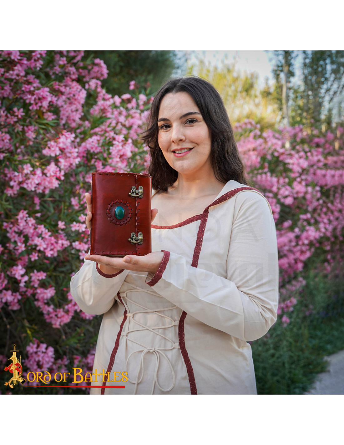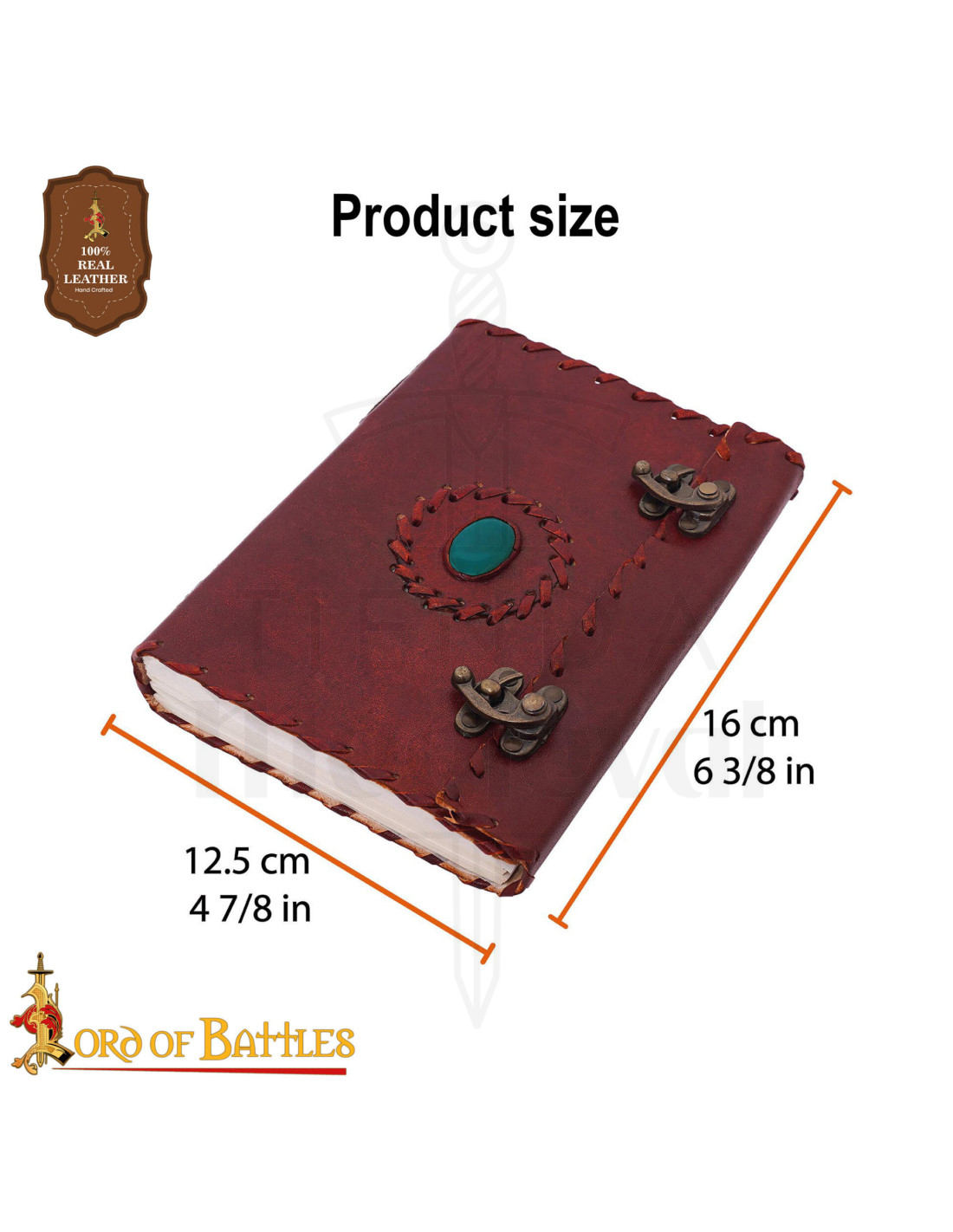 Ce Journal médiéval à couverture en cuir avec pierre et fermoirs en laiton se distingue par sa présence, offrant une expérience sensorielle dès le premier contact. La couverture rigide recouverte de cuir marron foncé protège vos histoires, tout en laissant transparaître la surface et la couture visibles, transmettant la sensation d’un objet travaillé à la main, unique et avec son propre caractère. La pierre ovale verte turquoise incrustée au centre crée un point focal qui transforme le journal en une pièce décorative, pas seulement en un carnet.