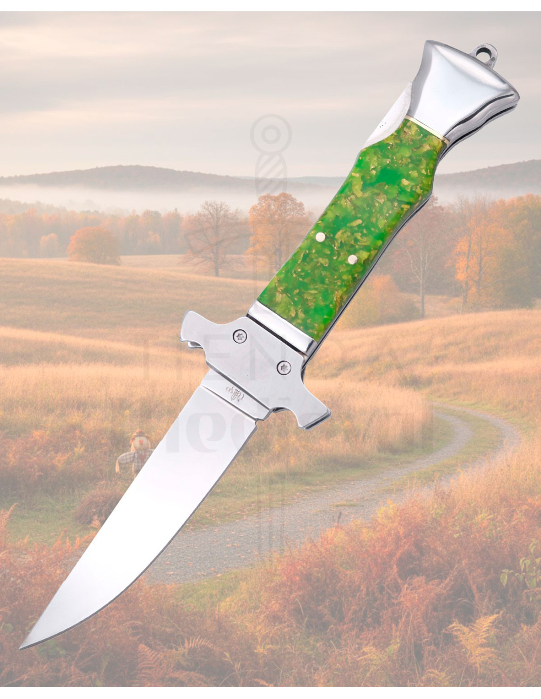 Le manche ergonomique, avec des tons verts et bruns en effet marbré, s'adapte à la main offrant une prise confortable et sécurisée. Les protège-mains métalliques polis aux points de jonction renforcent la sensation de robustesse, tandis que les rivets visibles transmettent résistance et confiance lors de la manipulation.