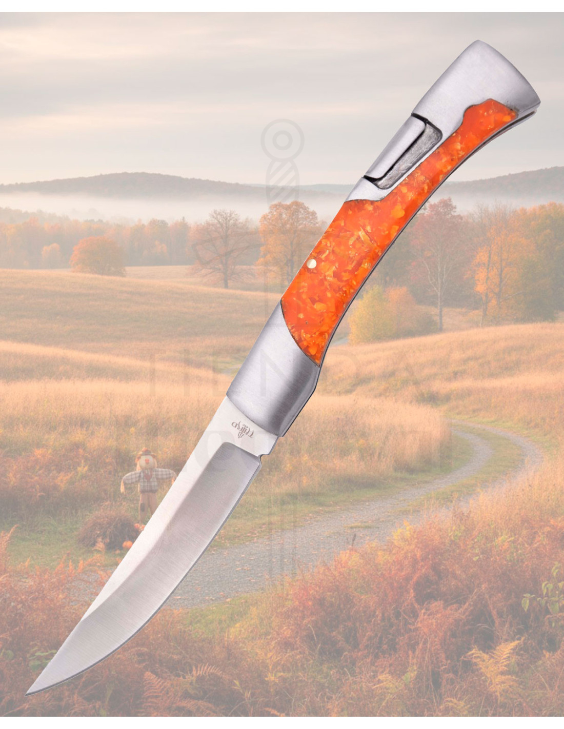 Le manche associe acier et une insertion d'acrylique orange fluorescent avec des veines marbrées, le rendant facile à repérer même dans des conditions de faible luminosité. Son design courbé épouse la main de manière ergonomique, offrant une prise sûre et une sensation de contrôle prolongée, tandis que les viroles métalliques polies renforcent la durabilité et l'aspect premium.