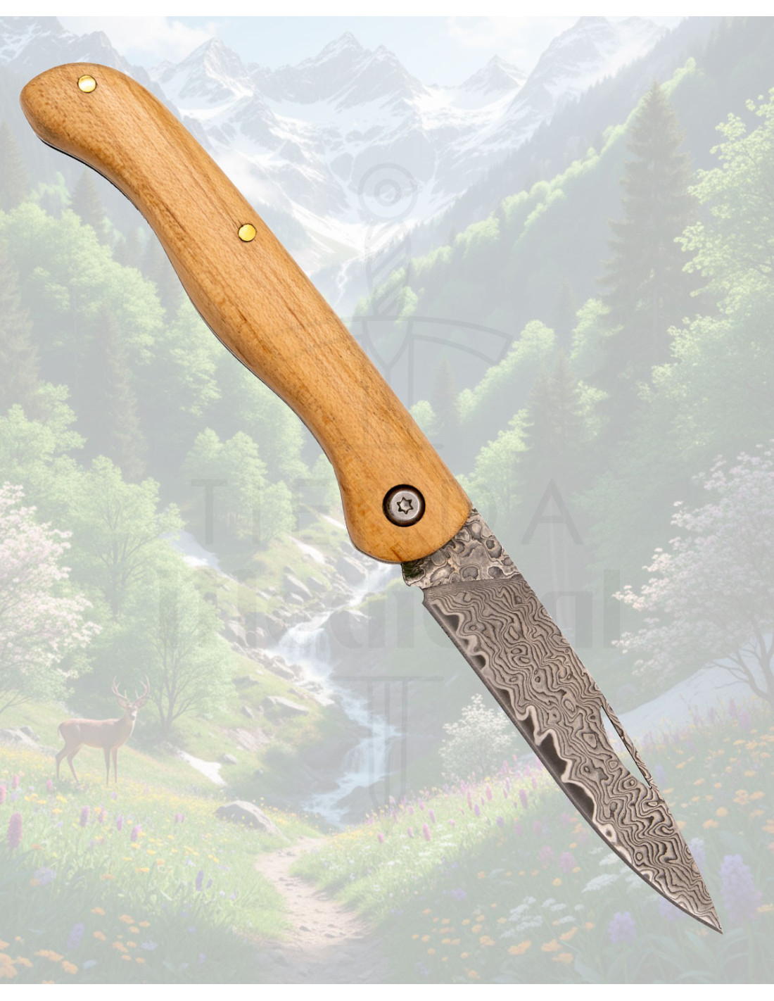 La poignée en bois clair offre une prise en main confortable et naturelle, conçue pour s’adapter à la main et faciliter la prise, même lors d'utilisations répétées. Les rivets métalliques visibles et la vis du pivot transmettent solidité et fiabilité au mécanisme, tout en permettant une ouverture douce grâce à la pratique fente de la lame.