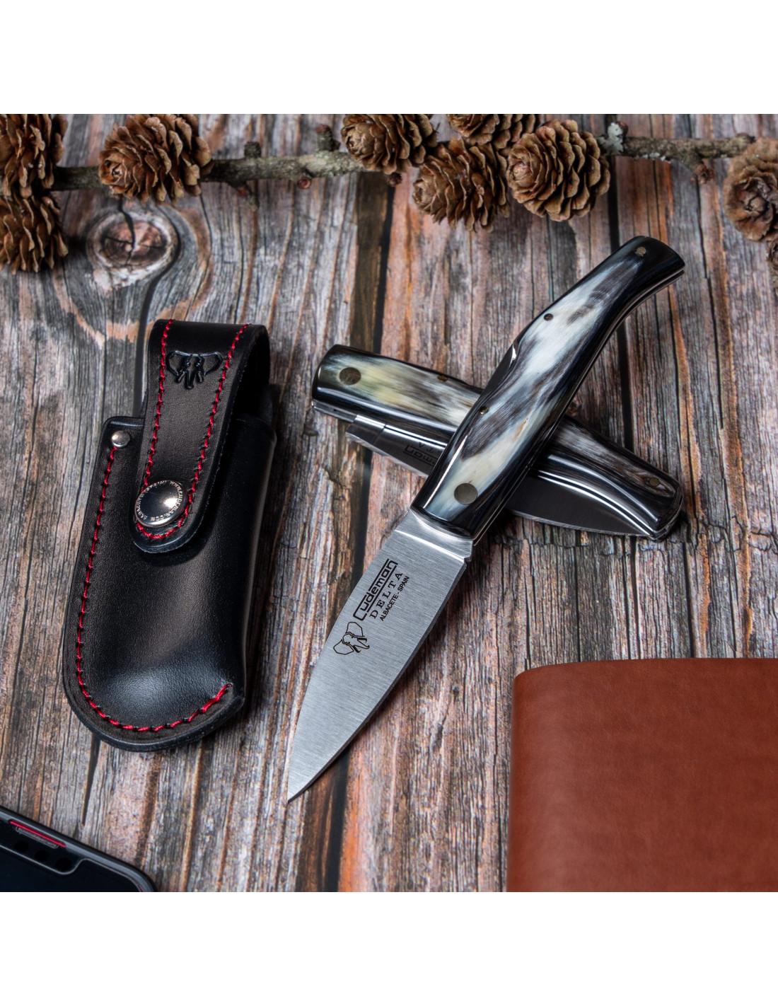 Le système de verrouillage central assure la sécurité et la stabilité de la lame pendant l'utilisation. L'ancre de poignée fidèle en laiton assure une construction solide et durable. La poignée en corne de taureau polie est non seulement frappante visuellement, mais offre également une prise ferme et confortable pendant l'utilisation. La corne de taureau est un matériau durable et robuste qui ajoute une touche distinctive au couteau. De plus, le couteau de chasse Delta est livré avec un étui en cuir noir de haute qualité, qui non seulement protège le couteau en toute sécurité, mais vous permet également de le transporter facilement et de le maintenir en parfait état.