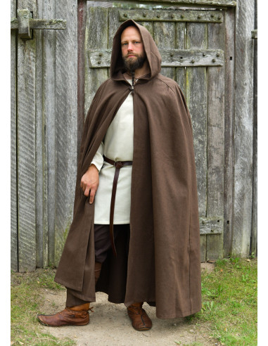 La capuche ample fonctionne comme un abri pratique, protégeant du froid et de la brise sans perdre en style, et la fermeture frontale avec bouton en bois ajoute une touche d'authenticité, facilitant le fait de mettre et d'enlever la cape rapidement lors des foires ou des reconstitutions. Tout cela est pensé pour que vous ayez l'air convaincant et que vous vous sentiez à l'aise durant de longues journées.