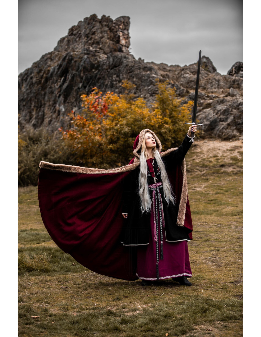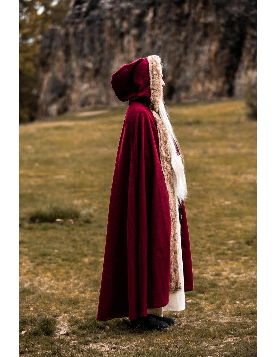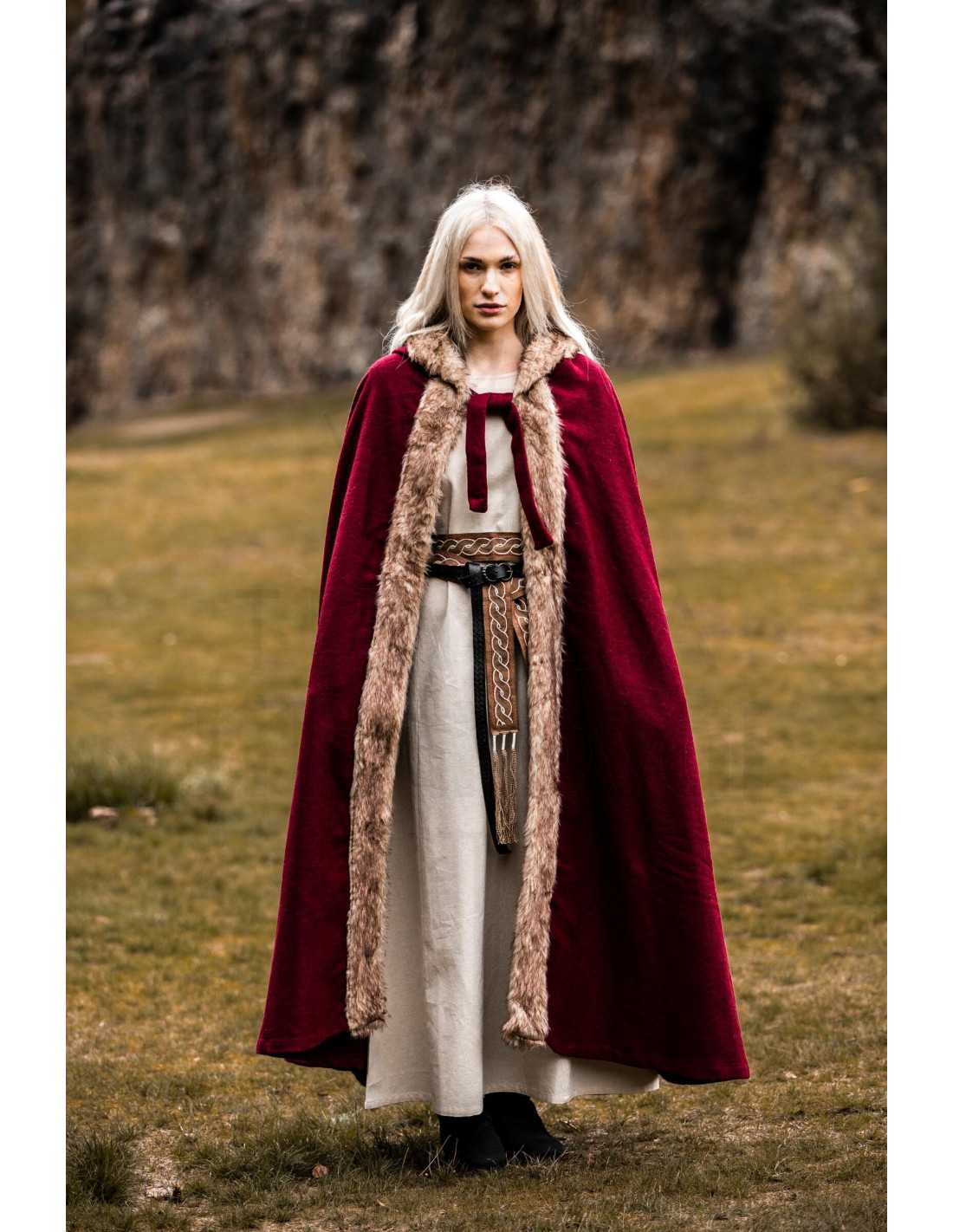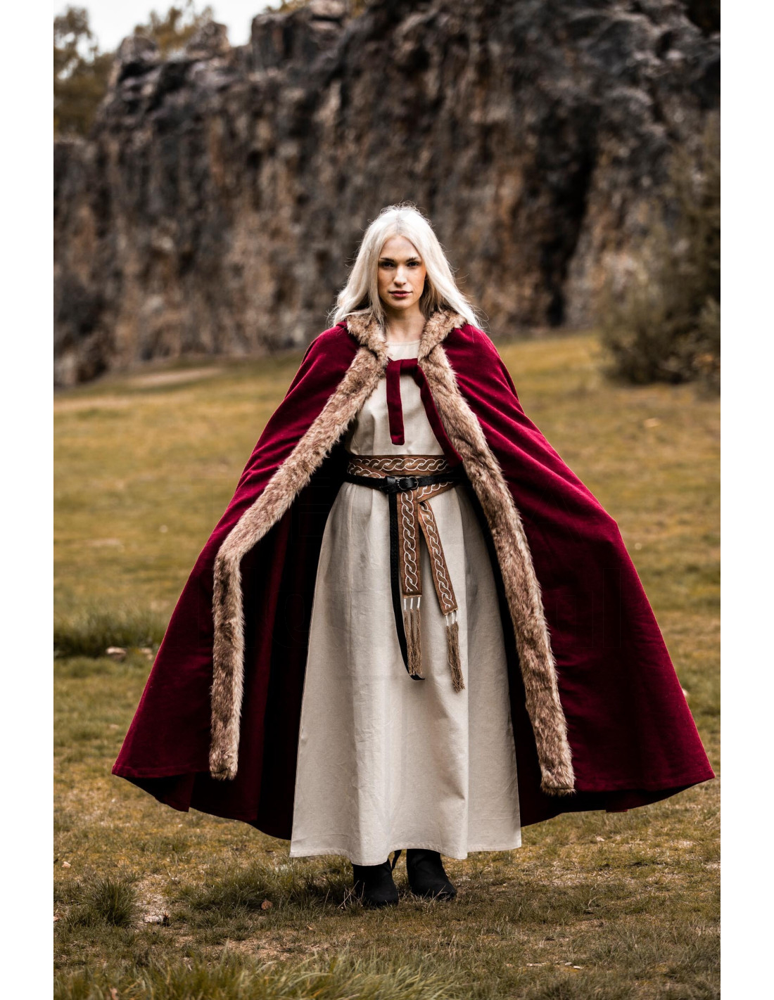 Si vous cherchez à acheter la Cape viking modèle Fjell avec fourrure synthétique, rouge, vous la trouverez pensée pour ceux qui valorisent présence et fonctionnalité. Le design offre une couverture généreuse qui enveloppe sans restreindre, idéale pour vous garder confortable lors de journées froides ou de légères pluies, sans renoncer à un aspect impeccable lors des foires, événements thématiques ou sorties décontractées.