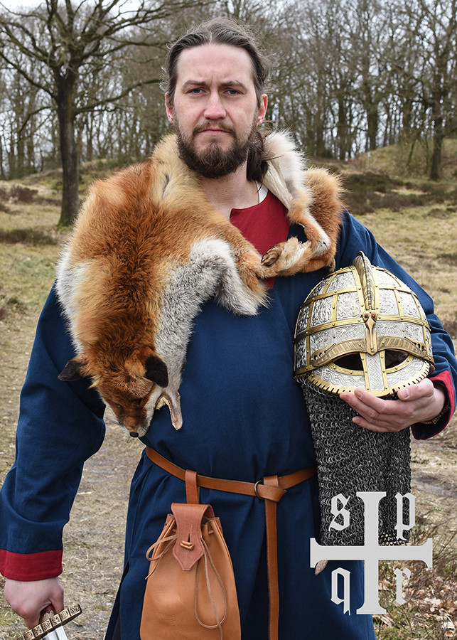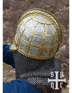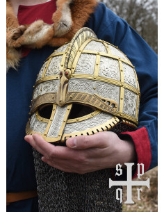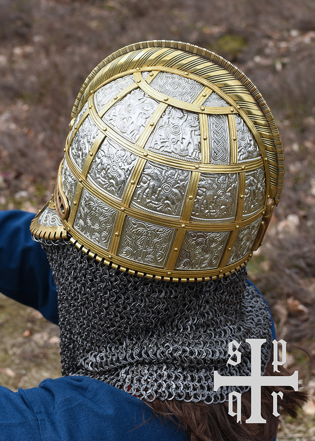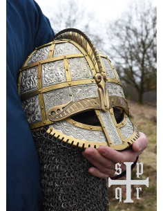 Cette réplique est en acier de 2 mm et équipée d'une cotte de mailles composée d'anneaux plats rivetés d'un diamètre intérieur de 8 mm. Les plaques sont en acier plus mince (tôles embouties) et sont fixées à la coque avec des sangles/bandes en laiton. La crête et les sourcils sont également en laiton. Les motifs complexes sont des reproductions fidèles des motifs originaux. Le casque à lunettes du début du Moyen Âge est livré avec une doublure en cuir réglable et une mentonnière.