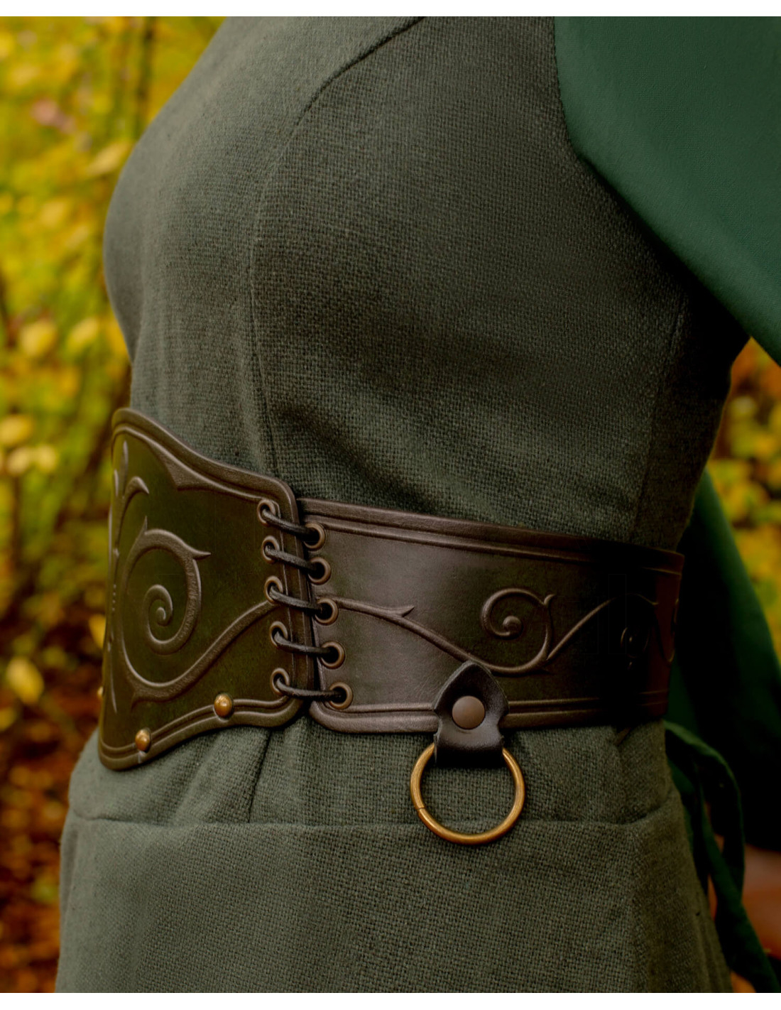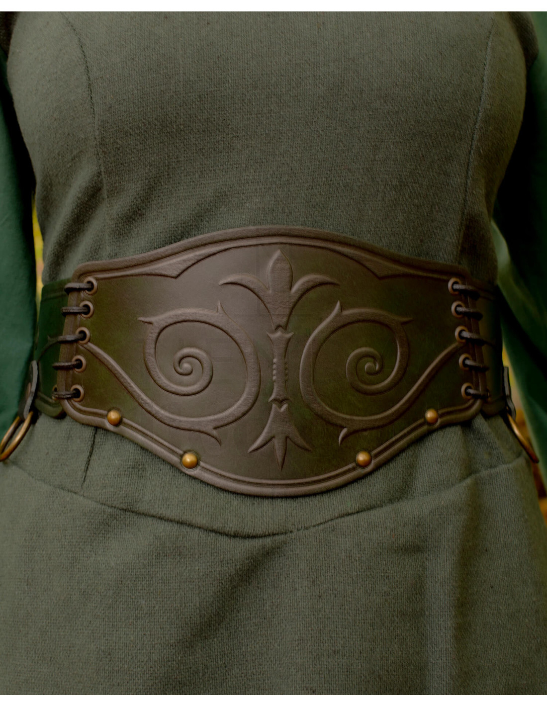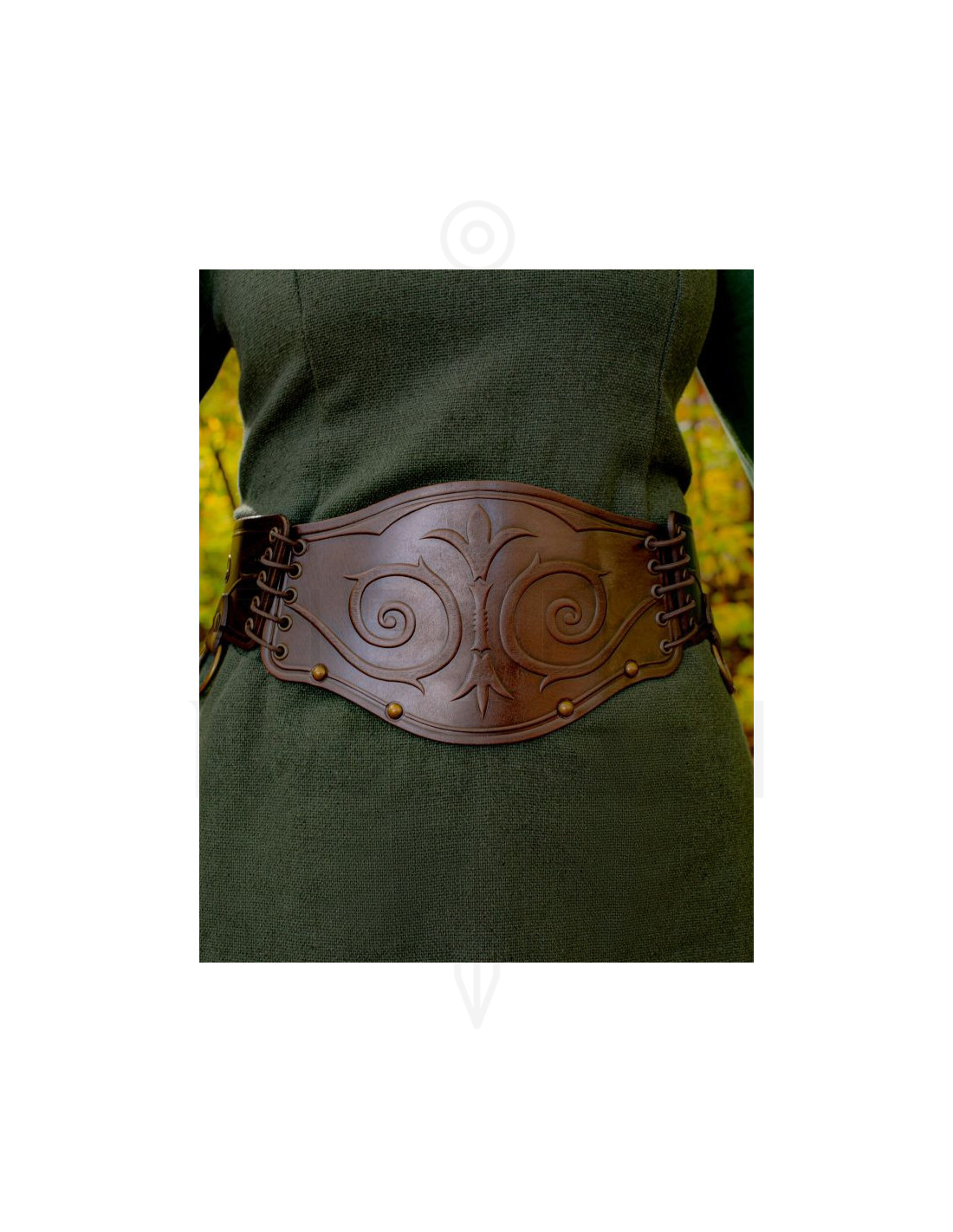 Cette ceinture large en cuir présente à l'avant un motif sculpté de spirales et de formes stylisées, conçu pour mettre en valeur la silhouette sans renoncer à la fonctionnalité. La finition lisse et polie du cuir apporte un aspect artisanal et résistant, parfait pour ceux qui cherchent une présence soignée et avec caractère dans les reconstitutions ou lors d'occasions spéciales.