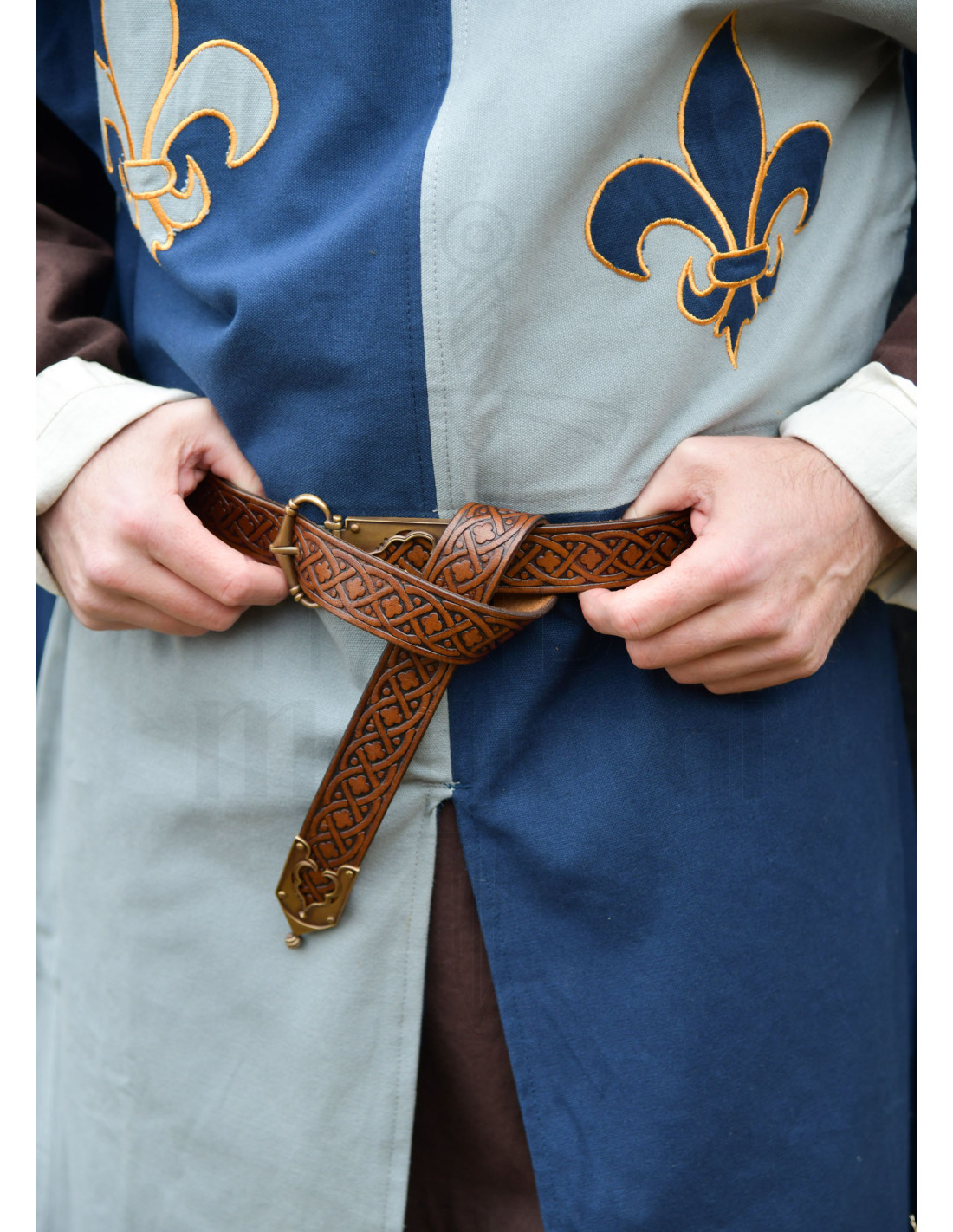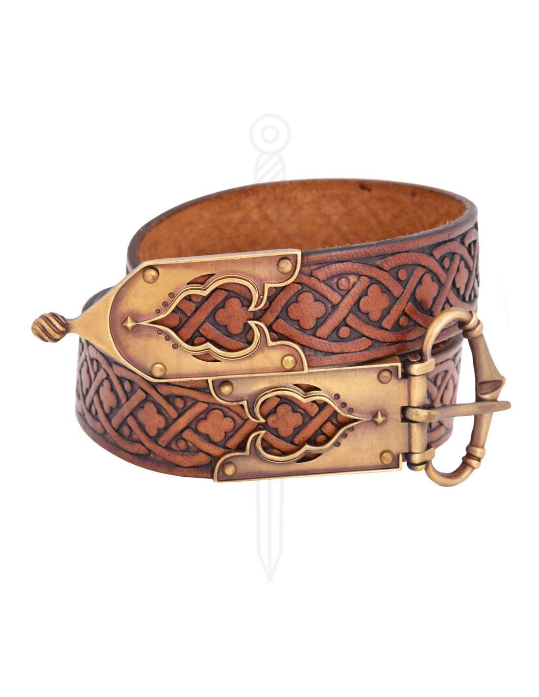 Cette ceinture allie un cuir robuste, travaillé pour conserver sa forme et vieillir avec élégance, à un relief continu mêlant tranchés géométriques et motifs délicats de trèfle. La gravure parcourt toute la longueur, offrant un aspect artisanal qui sublime aussi bien les tenues historiques que les propositions modernes, apportant texture et personnalité là où cela compte le plus.