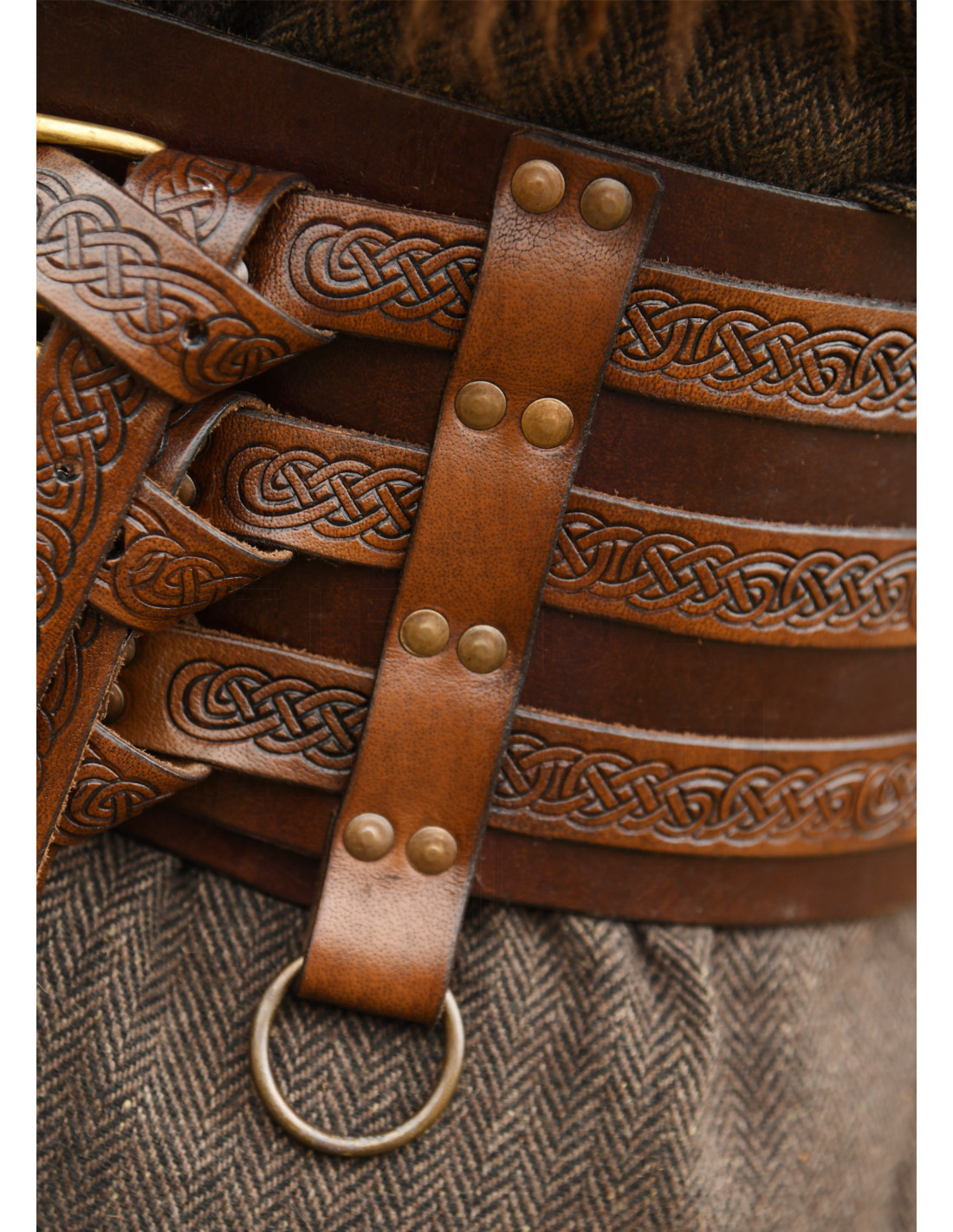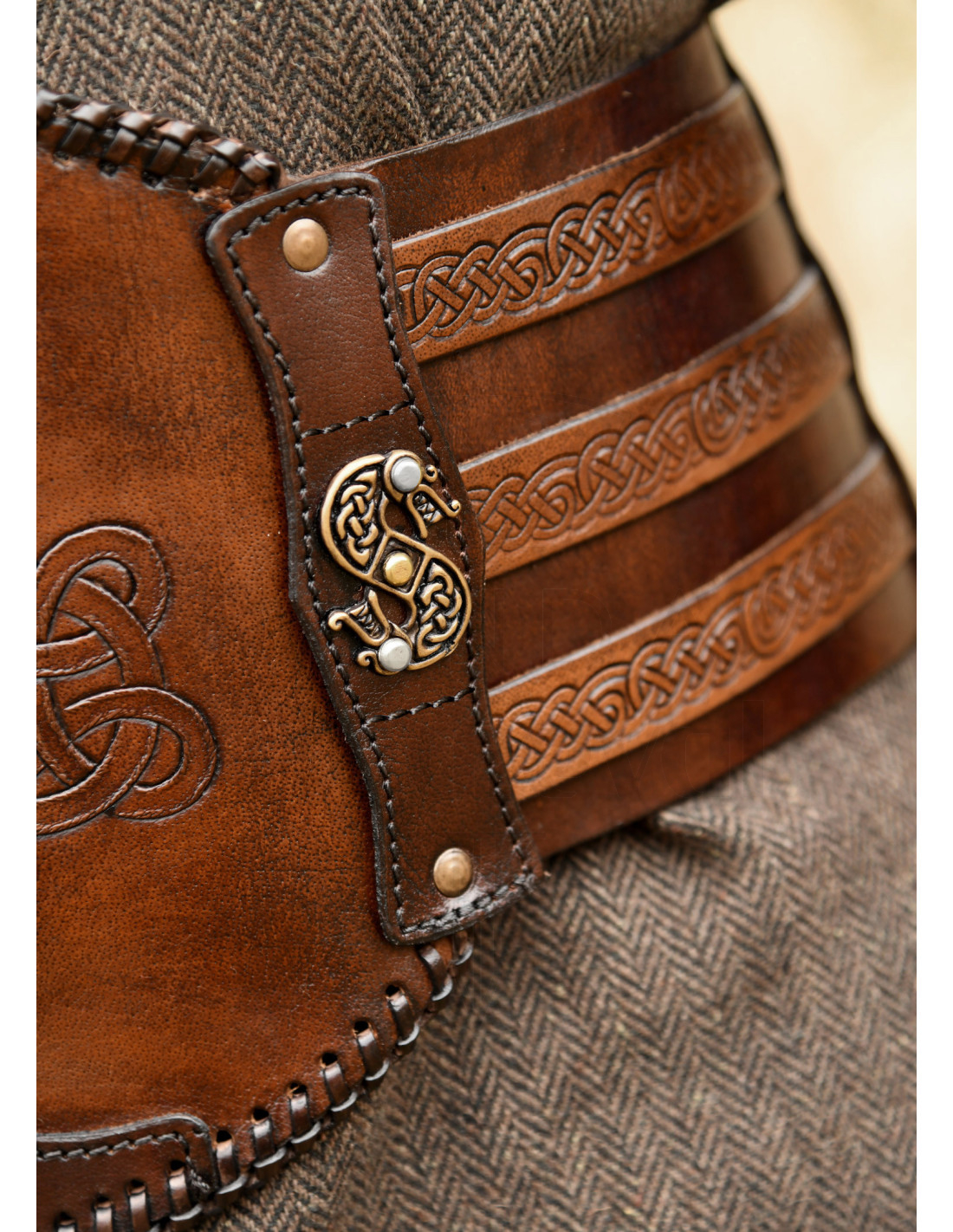 Son design est aussi fascinant que fonctionnel. Composée de trois ceintures individuelles entrelacées avec une pièce centrale large, cette ceinture s'adapte parfaitement à votre taille avec un confort exceptionnel. La pièce centrale, couvrant la zone lombaire, est repoussé avec un motif celtique complexe, symbole de connexion et d'éternité, décorée de ferrures en laiton en forme de dragon, qui ajouteront une touche légendaire à votre tenue et protégeront les objets que vous portez à la ceinture. Regardez l'image, voyez-vous le détail des nœuds entrelacés et la couture robuste ? C'est l'artisanat viking dans sa forme la plus pure.