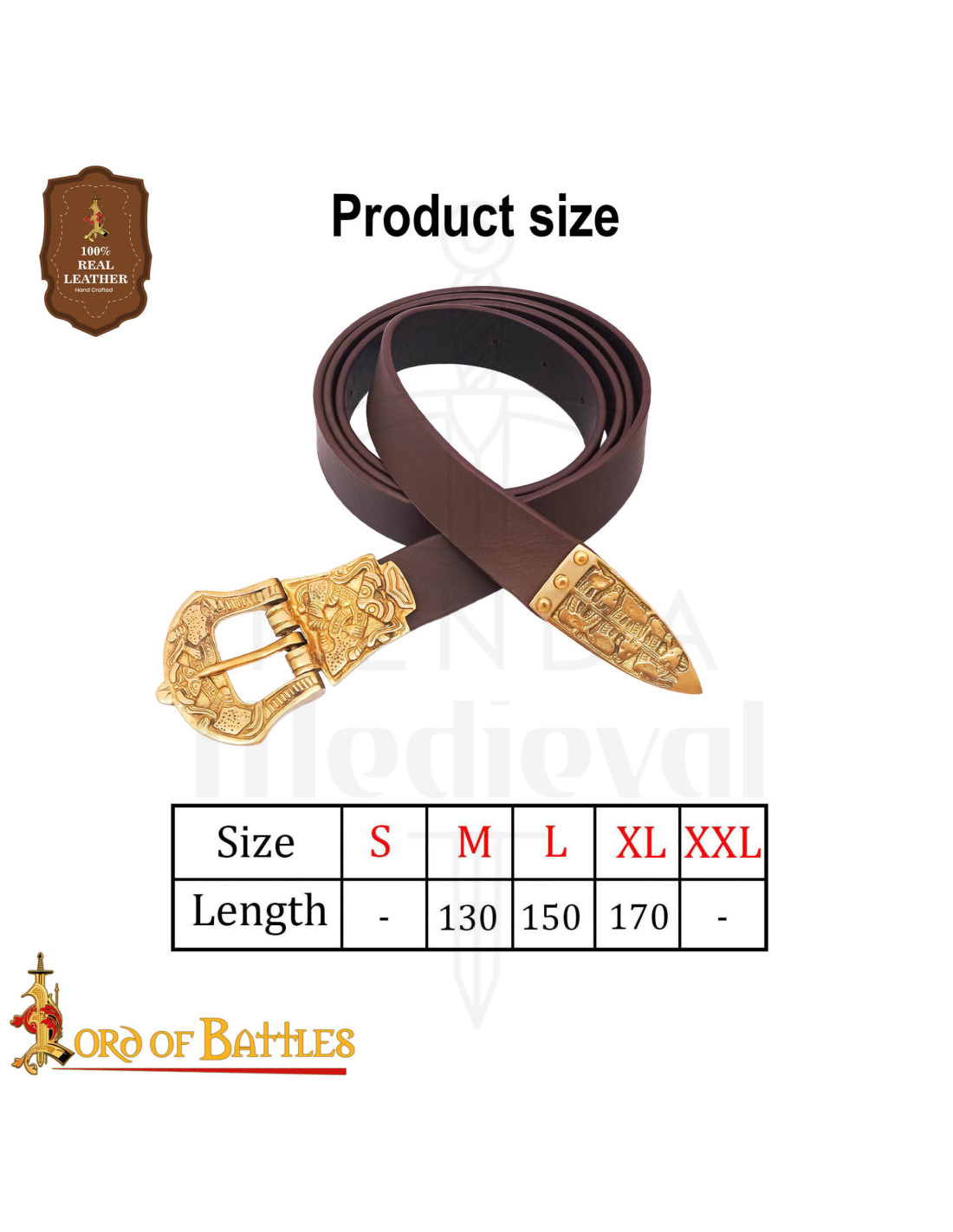 Ceinture viking en cuir marron, boucle et pointe en laiton ornées