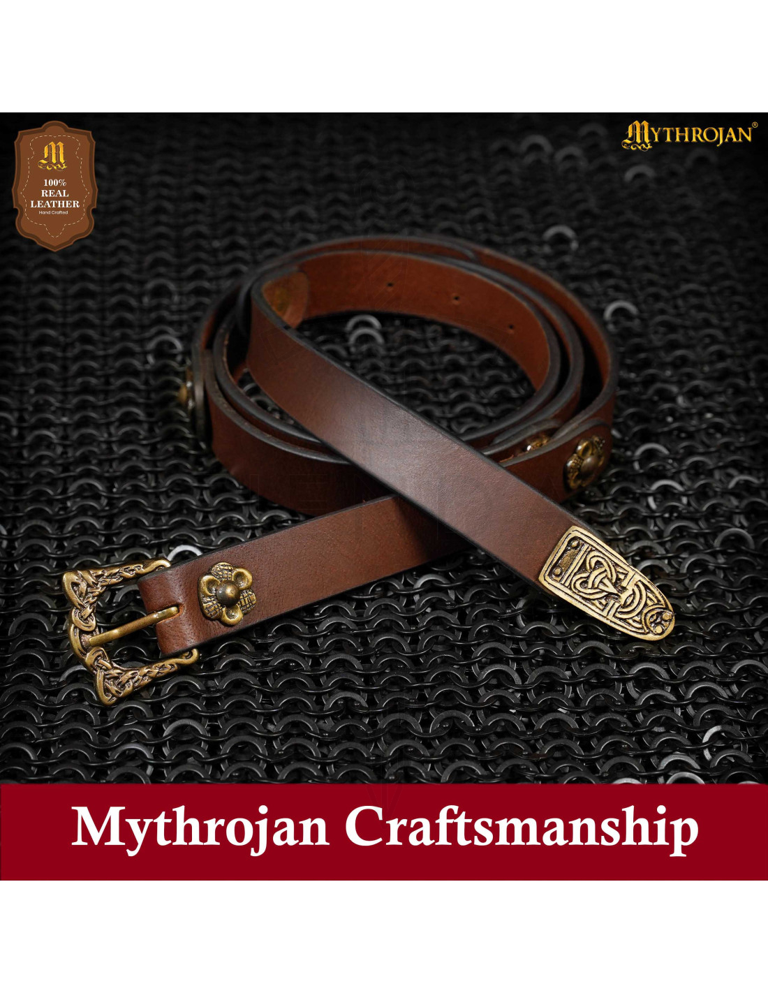 La Ceinture viking en cuir marron, boucle décorée en laiton combine une finition sombre qui évoque un cuir authentique, avec une boucle et des finitions en ton doré vieilli qui captent le regard. Les ornements métalliques avec des motifs floraux et médiévaux apportent un détail artisanal, idéal pour ceux qui recherchent une touche historique sans renoncer à l'élégance quotidienne. La finition en relief à l'extrémité apporte ce rendu poli qui donne l'impression que l'ensemble a été conçu jusqu'au dernier détail.