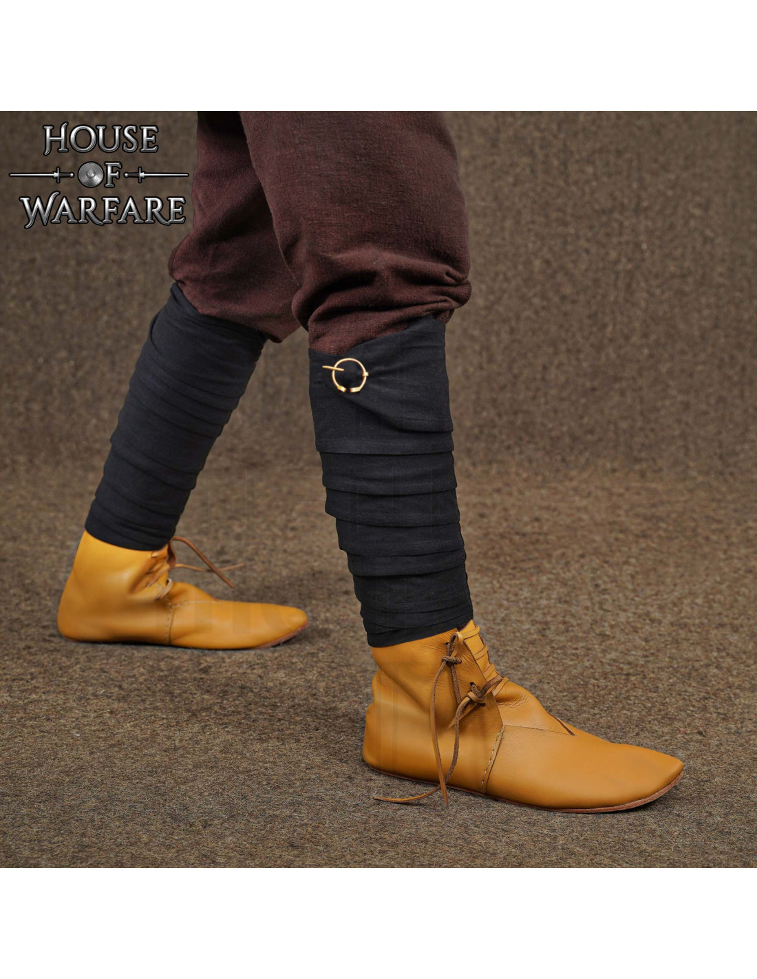 Fabriquées en coton respirant et avec une finition résistante, elles s'ajustent facilement pour maintenir le pantalon en place et éviter les frottements avec des bottes ou des pièces d'armure, ce qui améliore la mobilité et le confort lors de longues journées de reconstitution ou de festivals. La fermeture avec fibules en laiton apporte un maintien sûr et un point de détail visuel métallique qui se distingue sur le noir profond du tissu.