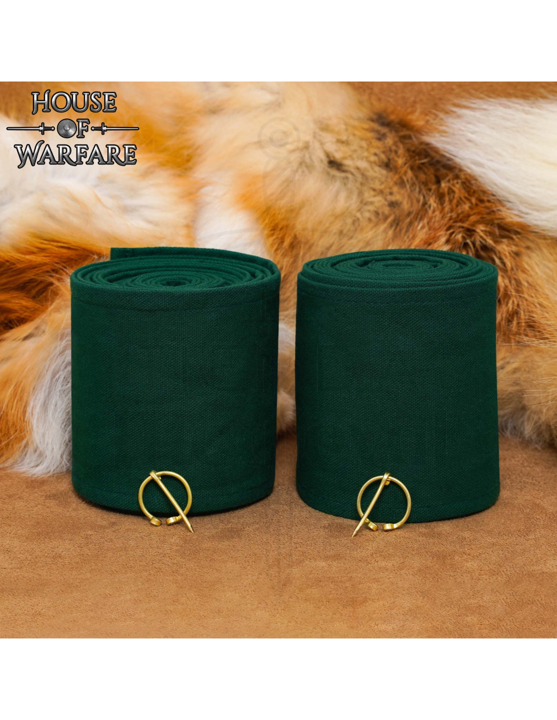 Fabriqués dans un vert foncé en tissu épais et à texture visible, les rouleaux se présentent l'un enroulé et l'autre partiellement déroulé, afin que vous puissiez apprécier à la fois la largeur et la qualité du matériau. En les plaçant, vous remarquerez comment ils enveloppent le mollet, offrant maintien et protection sans renoncer à la respirabilité, et comment les attaches en laiton avec un design circulaire et une barre centrale fixent en toute sécurité, gardant tout en place lors des journées de reconstitution ou d'événements prolongés.