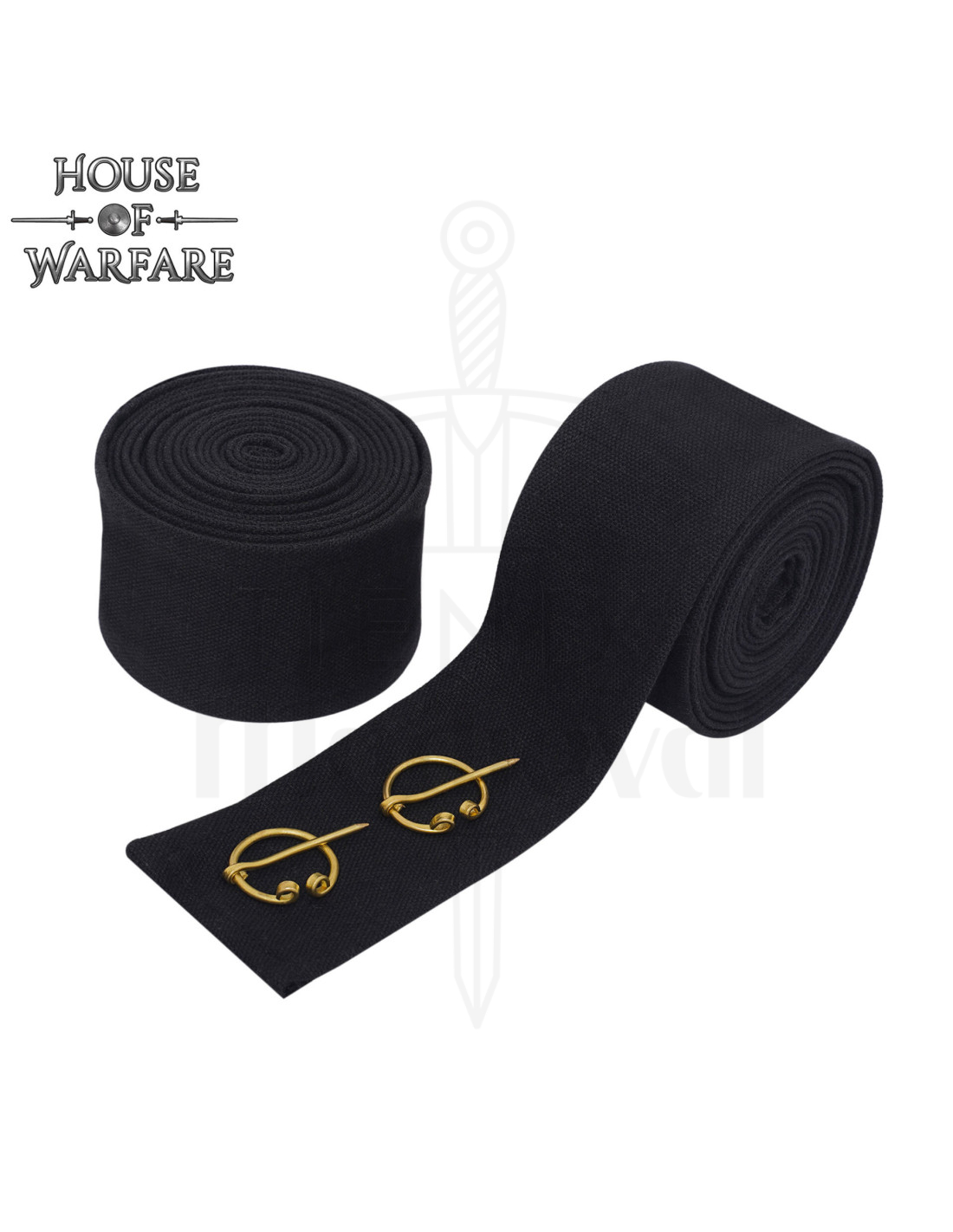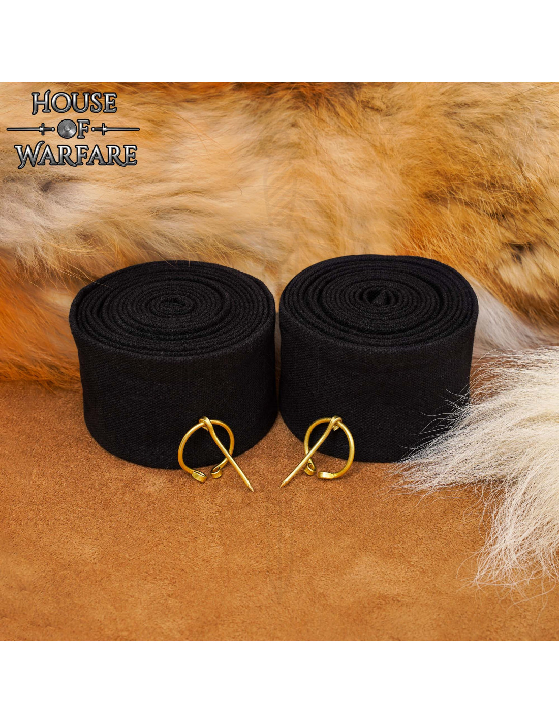 Sur l'image, on peut apercevoir deux rouleaux noirs, un compact et l'autre partiellement déroulé montrant la texture du tissu, ainsi que deux boucles métalliques dorées avec barre et spirales décoratives, ajoutant un point de détail historique et servant de système de fermeture élégant et fonctionnel.