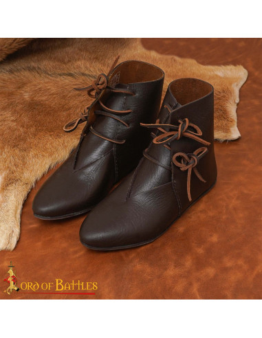 Ces bottes évoquent la vie quotidienne du Moyen Âge, des paysans aux artisans et guerriers, et se connectent directement avec l'esthétique des événements historiques et culturels. Pour ceux qui cherchent à acheter des bottines médiévales en cuir marron avec lacets latéraux pour leur équipement de reconstitution, elles représentent une option fidèle, travaillée et avec une identité propre.